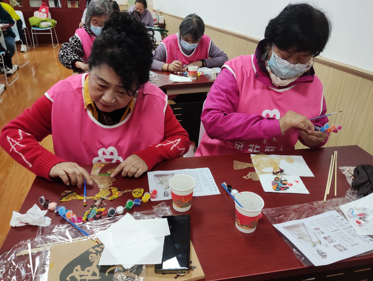 皮影艺术是我国民俗文化的活化石,是我国传统文化中的宝贵财富之一,它来源于生活,服务于人民,它有着自身独特的审美价值。活动开始,陈老师先向居民们讲述了皮影戏的由来、工艺等知识,大家认真聆听。随后陈老师展示了涂好颜色的成品,更是让大家眼前一亮,迫不及待地要大展身手,亲手给自己得皮影涂上颜色。
