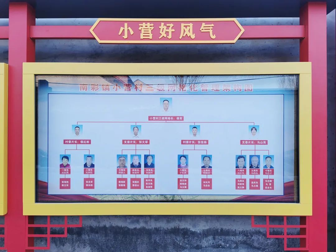 小营村宣传栏内,展示着三级网格化管理架构图。