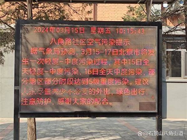 针对近期发生的空气重污染黄色预警天气,八角街道积极应对,采取严谨的内部防控措施。八角街道空气重污染应急指挥部办公室要求各社区及时通过微信公众号、微信群、电子显示屏等方式发布空气重污染黄色预警工作信息,提倡公众尽量乘坐公共交通工具出行。
