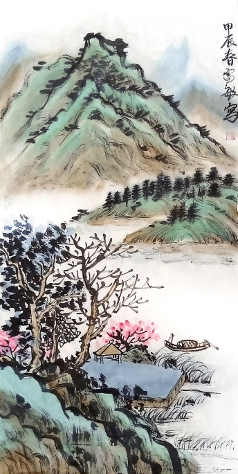 早樱初绽枝头艳,小溪潺潺响淙淙。
