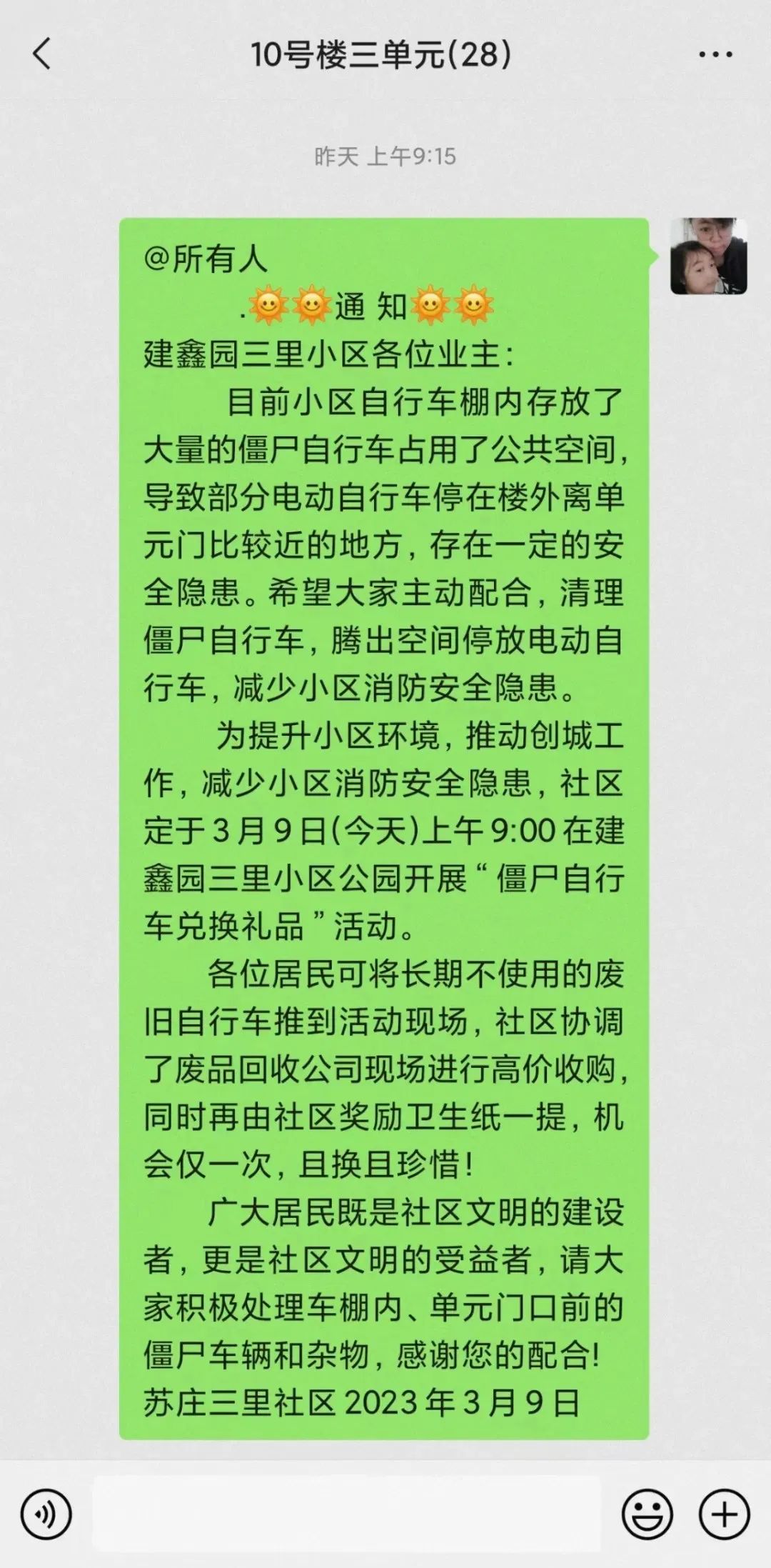 为回应居民的诉求,加强社区环境治理,消除社区安全隐患,助力全国文明城区创建,苏庄三里社区党委、居委会决心对6个小区里的“僵尸”自行车进行一次彻底整治,营造宜居清爽的小区空间。社区党委、居委会对此项工作进行认真研究,分析问题难点,决定发挥“好邻居”品牌作用,通过串门宣传说透、有奖兑换激励、志愿齐心动手的方法推动此项工作。