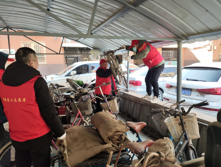 有人认领的“僵尸”自行车清理完毕后,社区开始组织人员对车身残损、部件缺失、长期停放且无人认领的“僵尸”自行车进行集中清理。社区发动“好邻居”志愿者参与清理活动,很快就把这些自行车挪到了指定暂存点,在认领缓冲期后,进行集中清理。