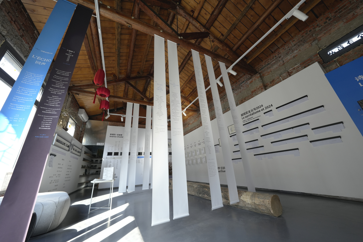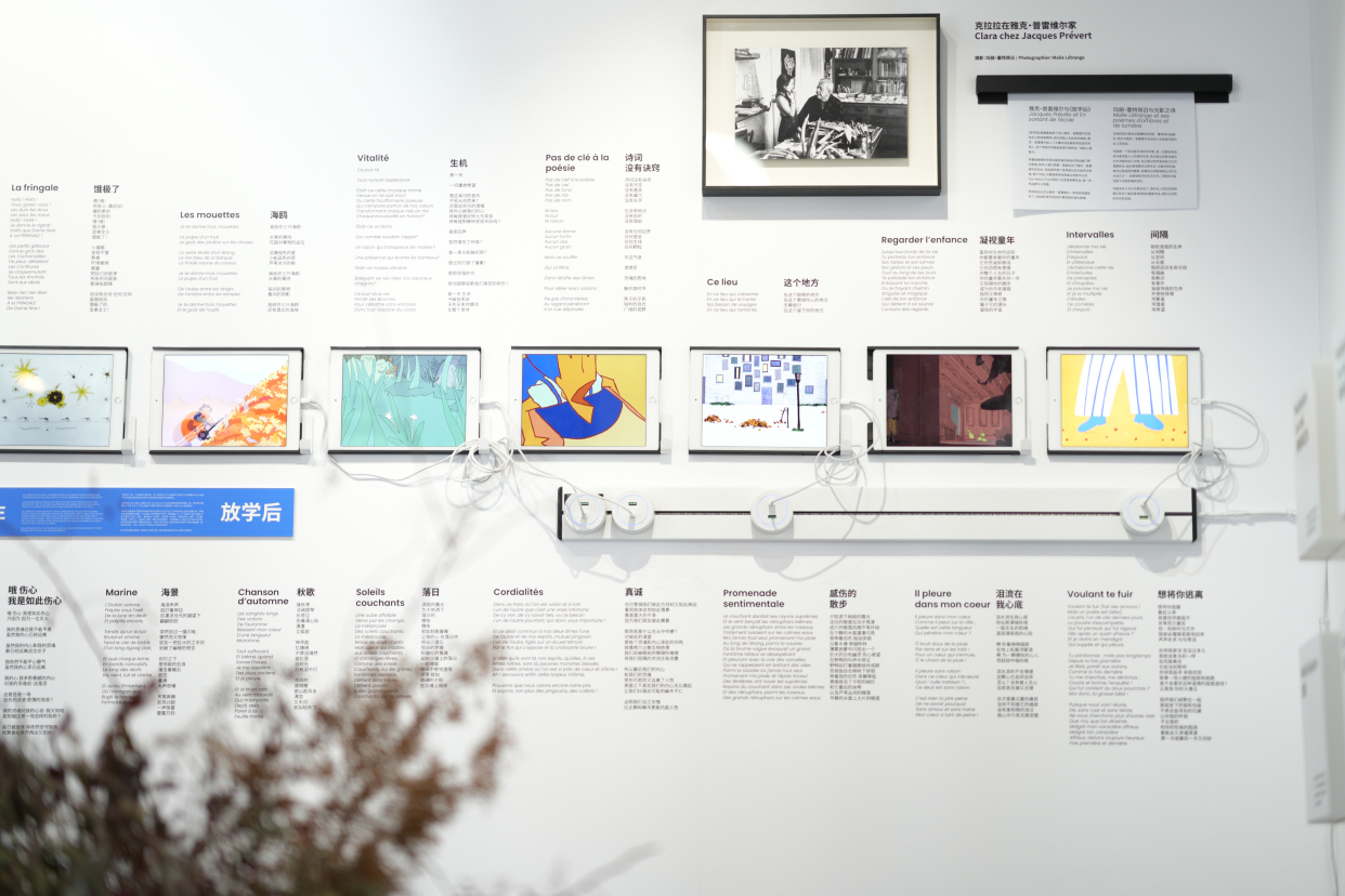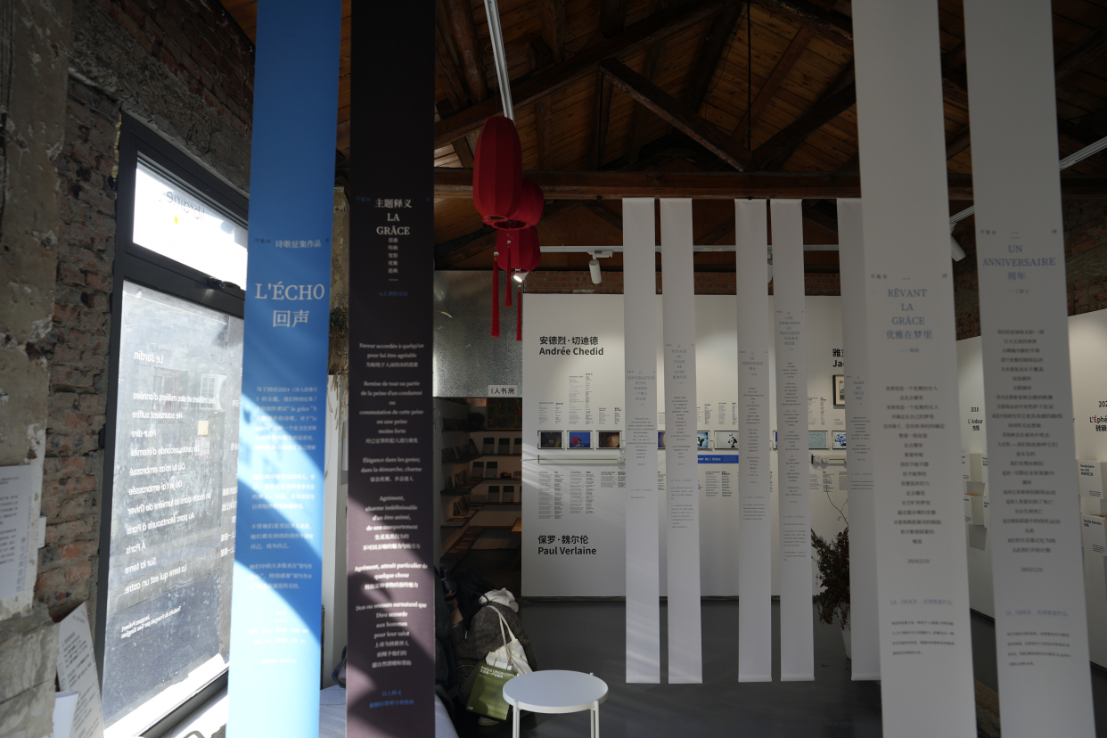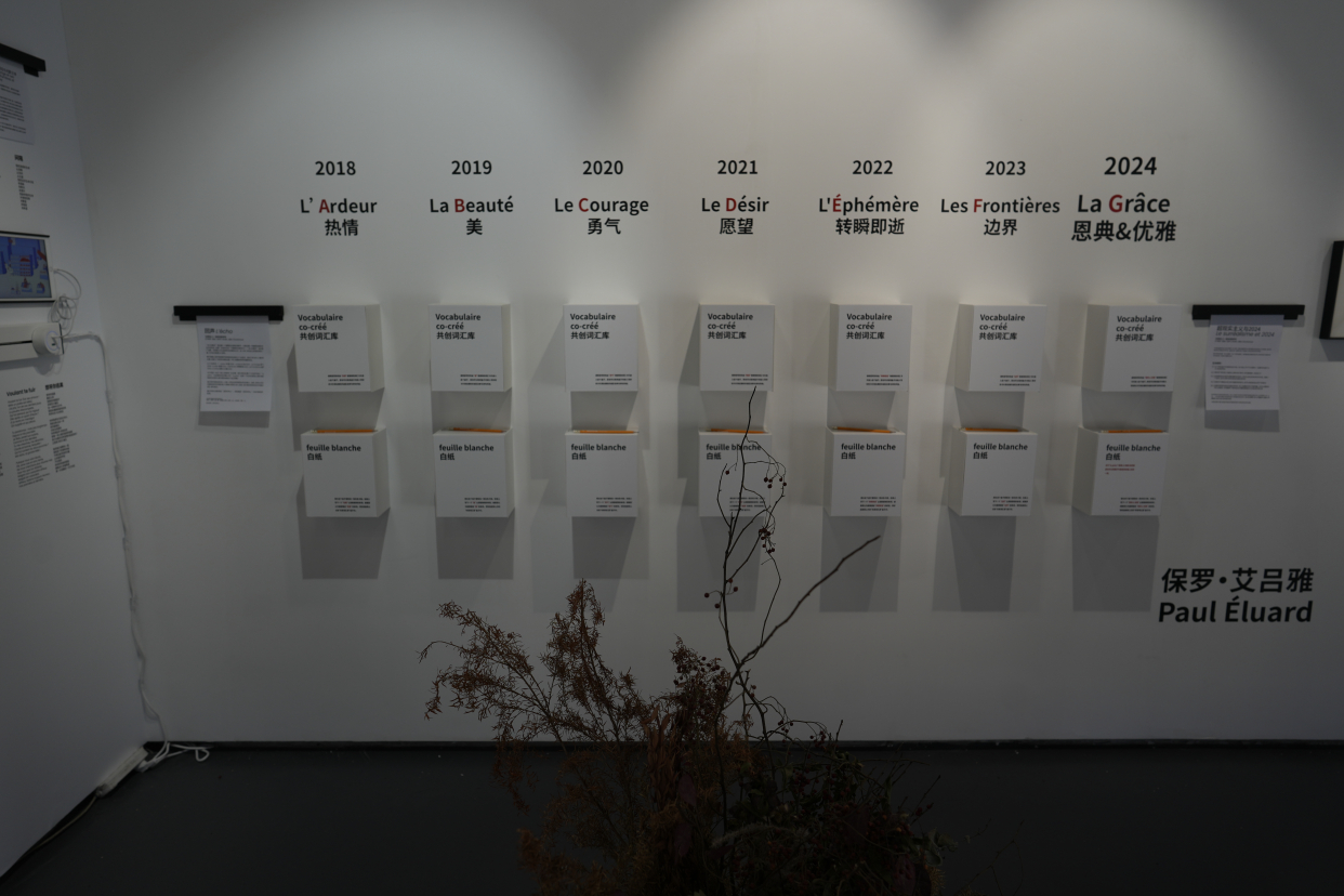 据主办方介绍,今年是中法建交60周年,举办这样一场跨领域的活动节,是希望能够让法语语言和文化多样性、法语传达的共同价值观与在地文化进行沟通,并邀请在地公众一起领略法语世界的丰富多彩。仔细观摩就会发现,《可能有诗》不大的展厅内被巧妙地安插了7个主题,“看不见的诗歌”的乐谱、用词卡创造有趣的诗句、散落在展厅各处的诗句……整个展陈让参观者可以在方寸之间通过看、听、读、写以及触摸的方式亲近诗歌,解锁更多关于诗歌的新奇体验。