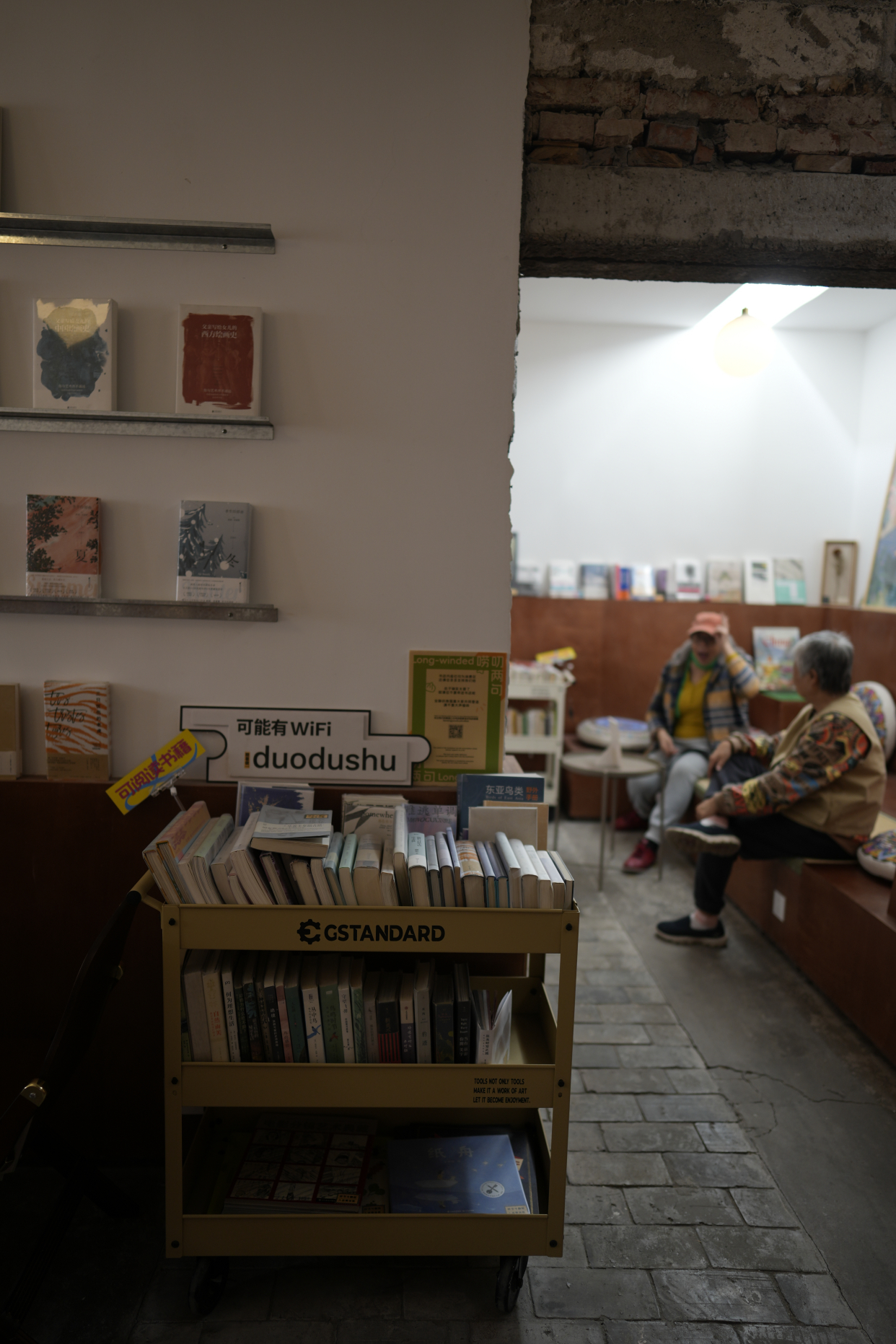 “只要想起一生中后悔的事,梅花便落满了南山。”“只有秘密可以交换秘密,只有迷可以到达另一个迷”……在可能有书书店内,同样被诗歌装点着。循着诗歌的痕迹,推开木门走入展览令一侧的书店,上下两层空间被不同的功能区巧妙的分割开,朋友小聚、办公学习、电影放映……不同的人群都能在这里找到属于自己的“舒适区”。而不管走到哪个位置上,周围都会图书相伴左右。或许就在不经意的抬头时,正巧看见的那本“嵌”在连廊墙壁缝隙间的一本书,陪了你一整个下午。也正是这不期而遇的“小美好”让不少读者将“可能有书”奉为最适合“i”人的书房。在这里,你总能看到在书店内点上一杯咖啡的读者,伴着台灯光亮,细细品读着心仪的书目,任时光慢慢流淌。