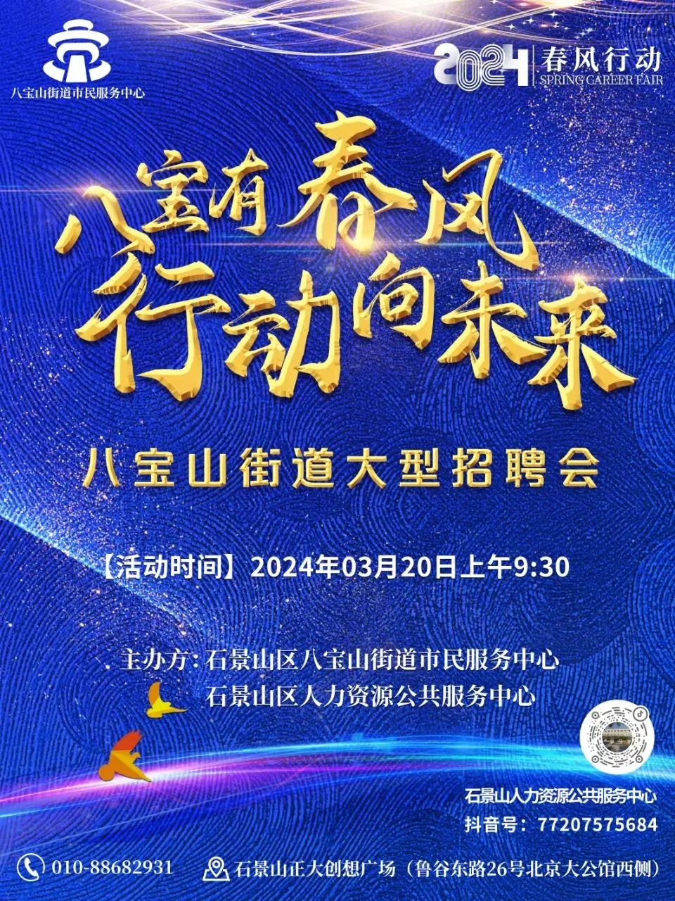 为了更好地满足辖区内外各用人单位及求职者的需求,3月20日上午,八宝山街道与石景山区人力资源公共服务中心在大正创想广场(鲁谷东街26号北京大公馆西侧)联合举办大型招聘会,届时将有中细软集团有限公司、北京祥龙博瑞汽车服务(集团)有限公司八分公司、北京景山朗兴科技有限公司、中科启蒙(北京)科技有限公司、迪卡侬(北京)体育用品有限公司玉泉路分公司、秋然食品科技(北京)有限公司等39家单位现场招贤纳士,共提供120个岗位,计划招聘761人,欢迎广大求职者积极参加。