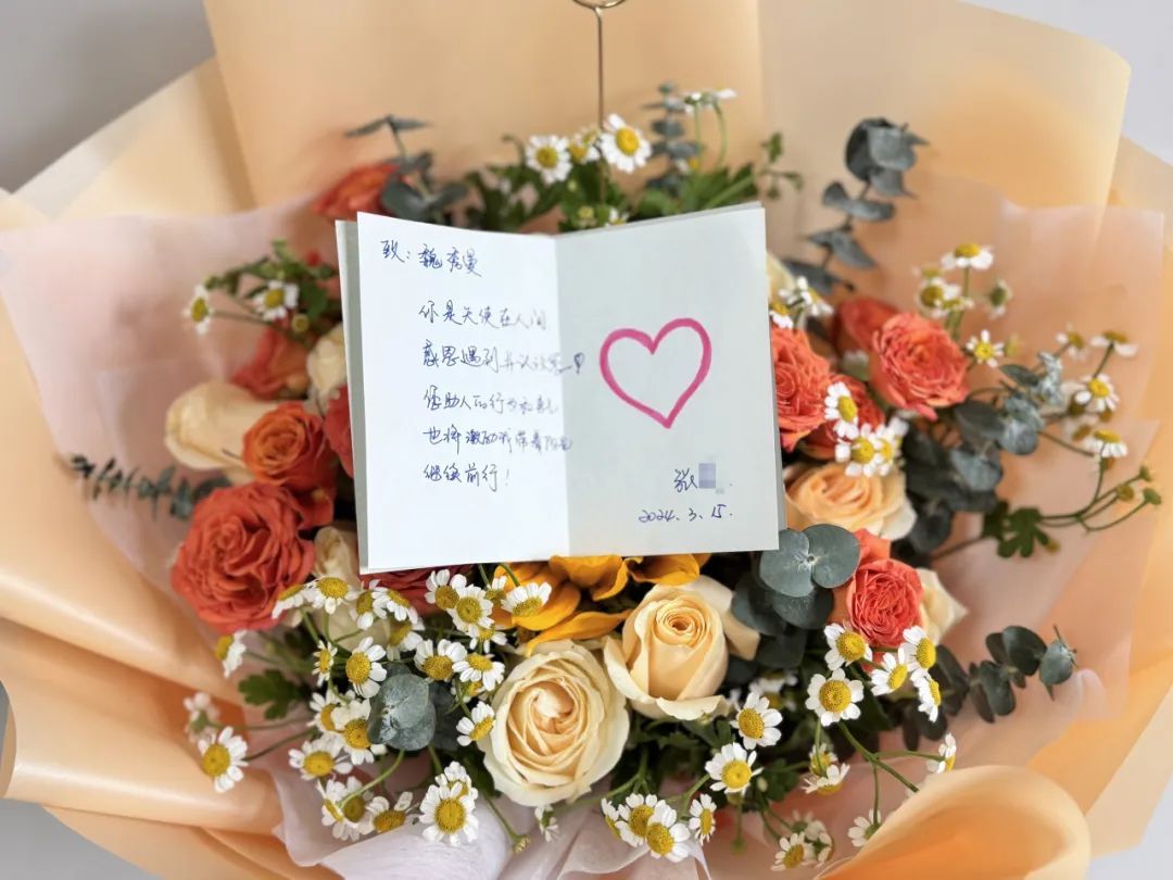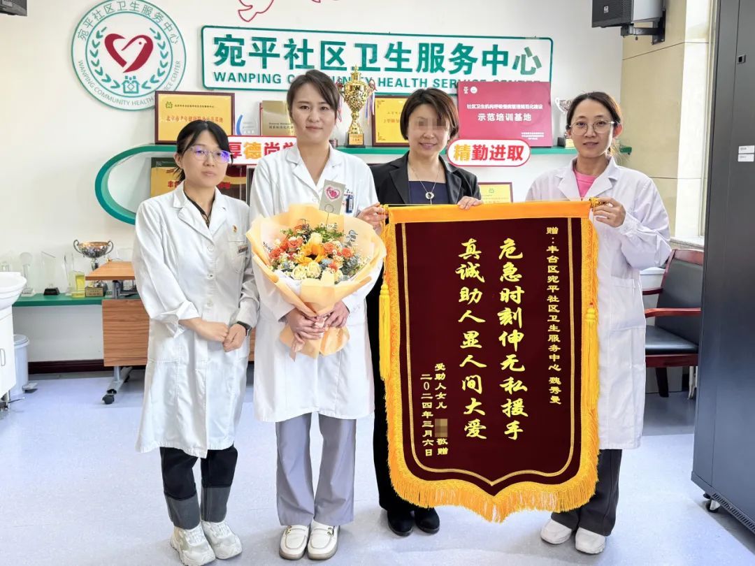 3月15日,张女士来到宛平社区卫生服务中心办公室,送来一束鲜花和一面锦旗,“十分感谢贵单位魏秀曼女士,热心救助了我父亲!”。