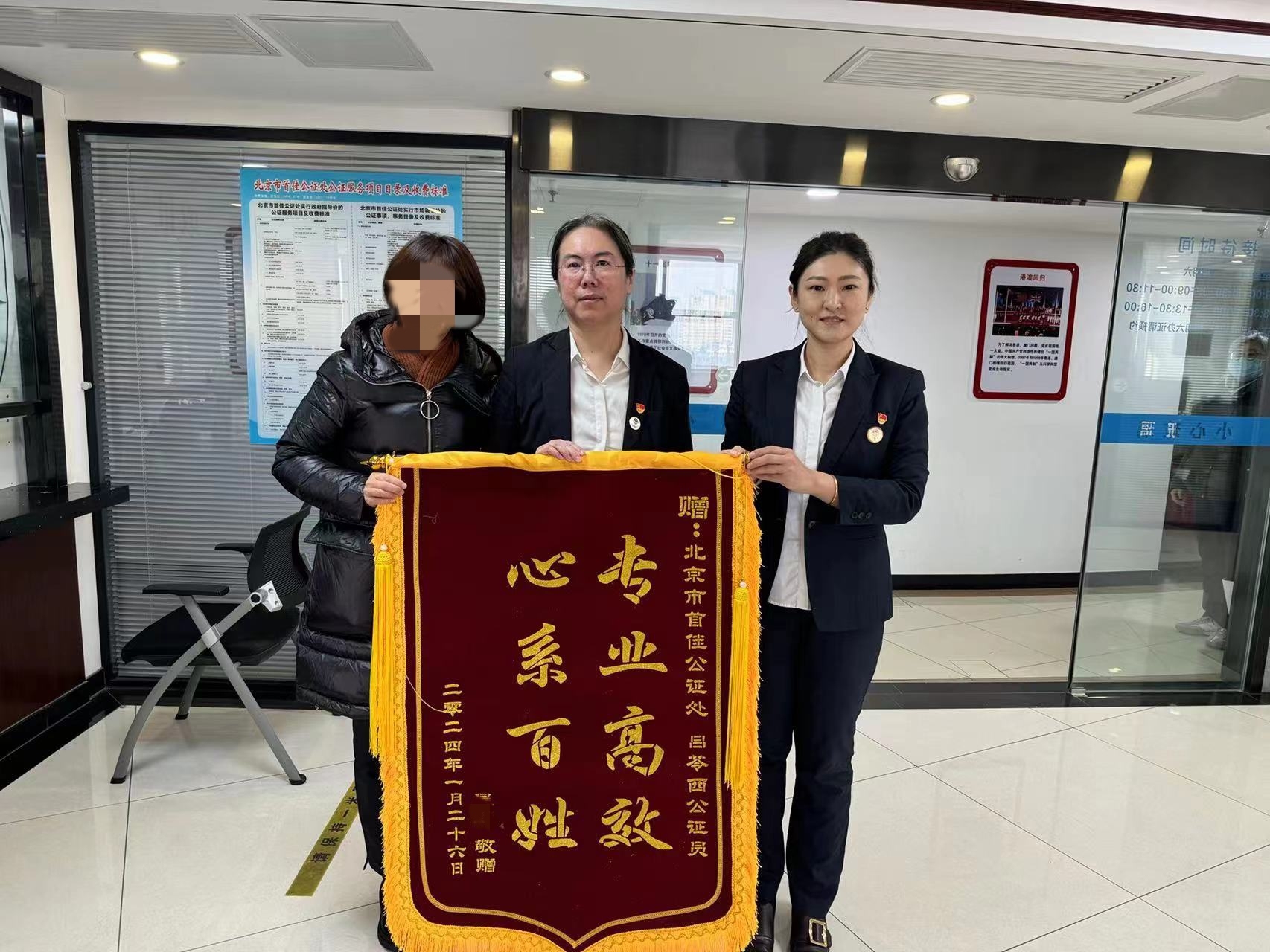 12345热线的“表扬工单”只是丰台区优质公证服务的一个缩影。前不久,公证处收到办事群众亲笔写下的表扬信,一对老夫妇表扬公证员在为其办理公证时“全心全意为人民服务”“甘当一颗永不生锈的螺丝钉”;春节前夕,公证处收到两面锦旗,分别感谢公证员提供了高效且温暖的服务。