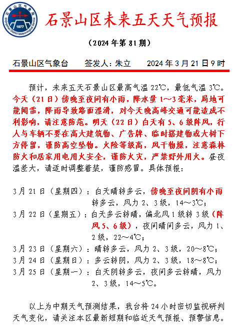据石景山气象台预报