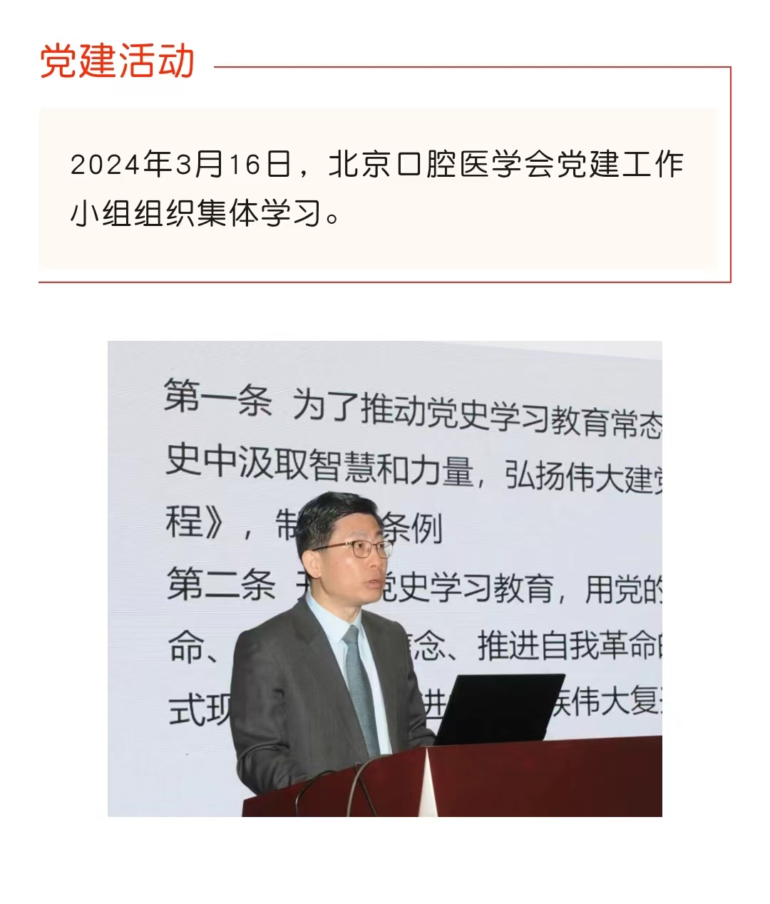 党建活动还邀请了北京京剧院国家一级演员郑潇,以《弘扬中国传统文化之京剧的魅力》为题进行讲座,从京剧的历史起源讲起,结合个人学习工作系统介绍国粹艺术,为与会党员上了一堂生动的中国艺术课。大家通过对京剧艺术的了解,进一步理解中国传统文化,激发广大口腔医务工作者对守正创新思想的深刻理解。