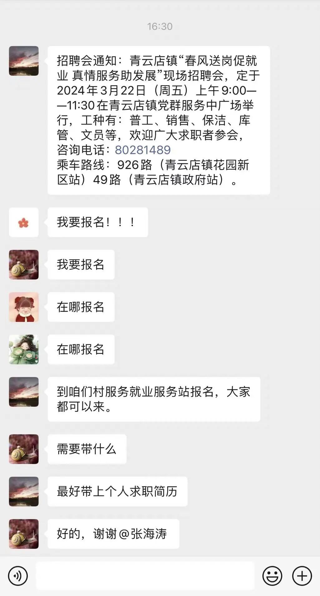 为精准掌握全镇劳动力当前就业情况,提供适应市场变化的就业服务,在此次招聘会前期准备阶段,青云店镇扎实开展农村劳动力就业信息摸排和调查工作,依托电话、微信和广播等多种方式开展摸排调查,通过“线上+线下”相结合的形式,全面摸排镇域待业人员基础情况,同时面向全镇求职人员、失业人员开展就业意向调查,动态掌握镇域待业人员求职意愿。