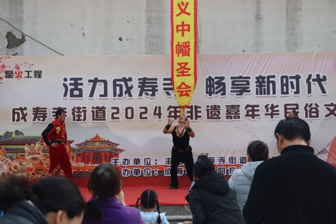 随着街道社区办副主任刘寅宣布“成寿寺街道非遗嘉年华民俗文化节开幕”的音乐响起,演出现场沸腾起来了!首先,中幡表演闪亮登场,五六十斤的中幡在艺人们的手中上下翻滚,轻松自如,他们时而将中幡单手托举,时而双手合抱,高高抛起,竹竿上的幡,在空中翻飞起舞、发出悦耳的铃铛声,既惊险又刺激,让在场的观众惊叹不已!