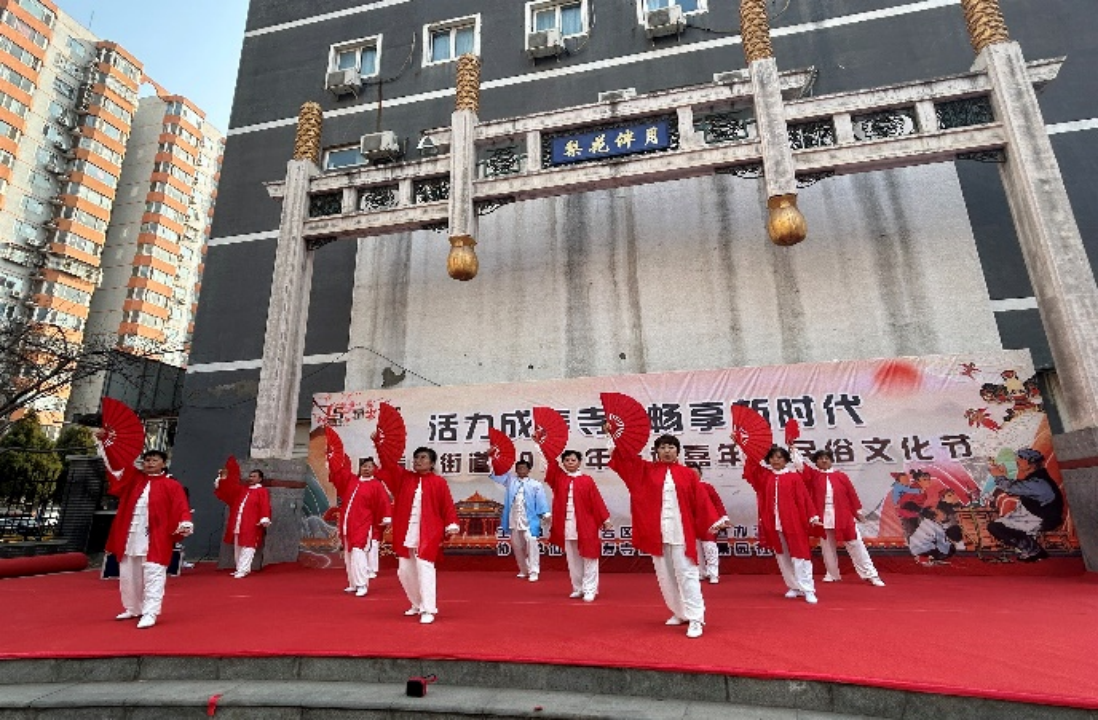 瑞成街社区太极扇表演,动作整齐划一,她们将传统太极与扇子艺术完美融合,通过扇子的合开,翻飞、旋转等动作,让在场观众感受到太极的无穷魅力。