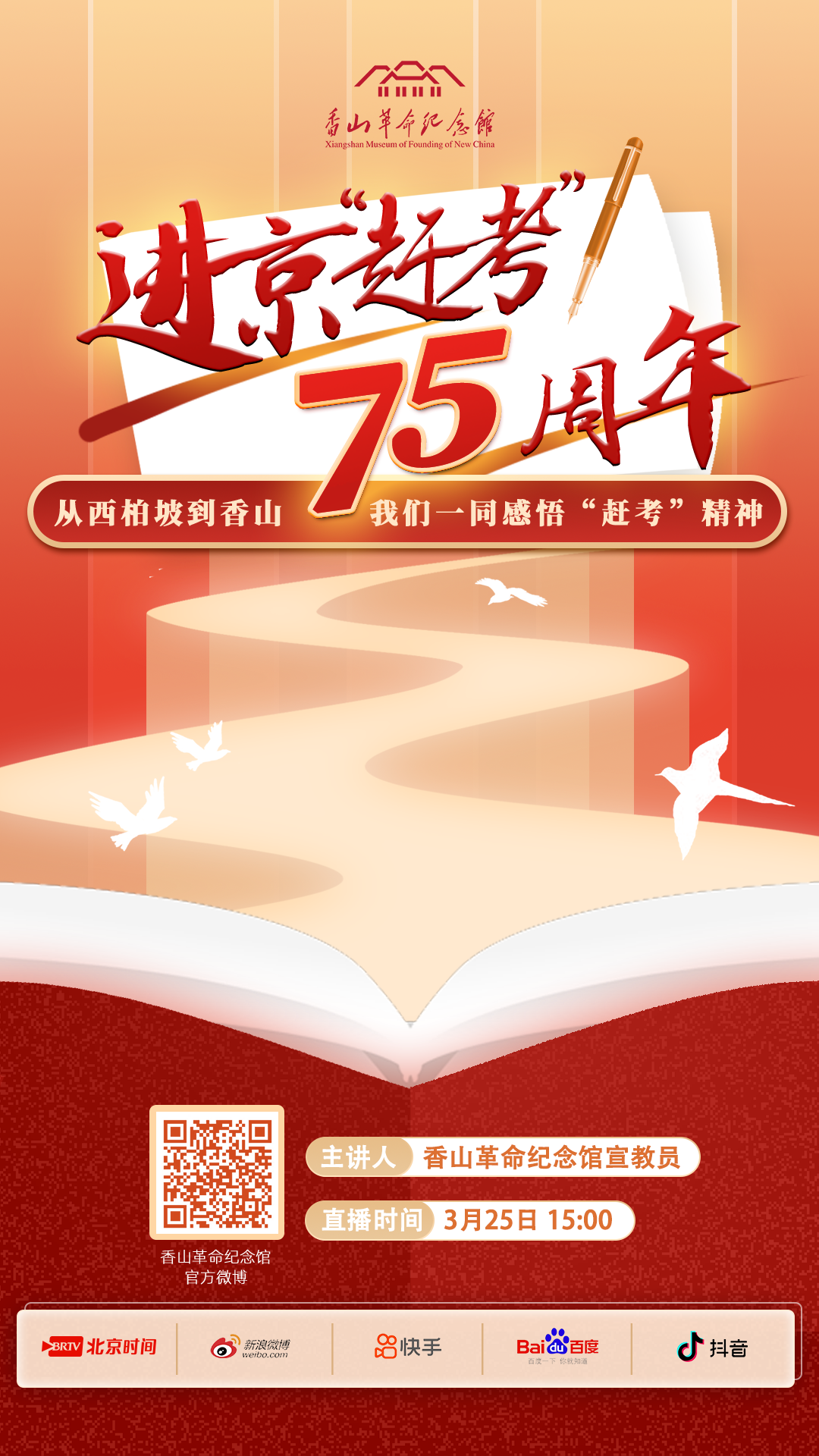 为了缅怀毛泽东等老一辈无产阶级革命家的丰功伟绩,激励全党和全国各族人民始终保持奋发有为的进取精神,永葆党的先进性和纯洁性,以“赶考”的清醒和坚定答好新时代的答卷,我馆将于3月25日,中共中央从西柏坡迁驻香山75周年之际,联动北京市爱国主义教育基地融媒体传播平台——“京华丹心”,通过云直播的形式跟大家一起线上参观“进京‘赶考’——纪念中共中央从西柏坡迁驻香山75周年图片展”,我馆宣教员将带您一同回顾这段光辉的“赶考”历程,感悟“赶考”精神的深刻内涵。