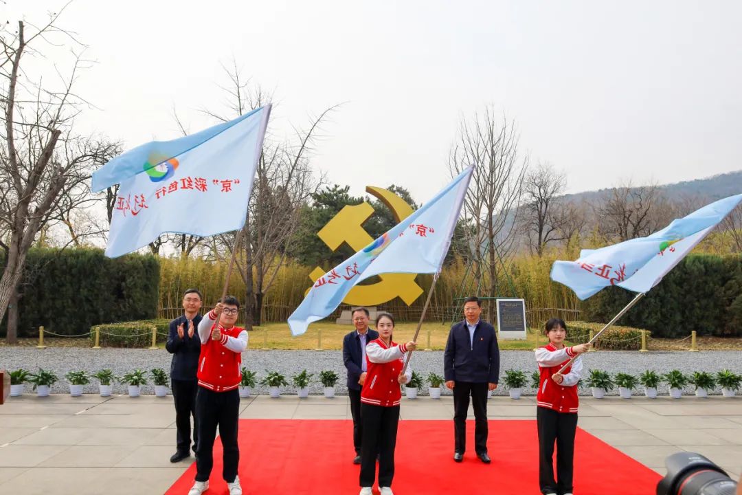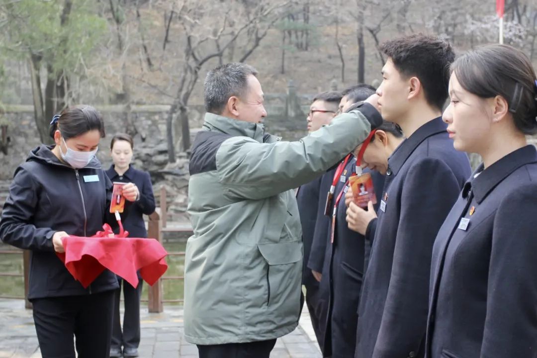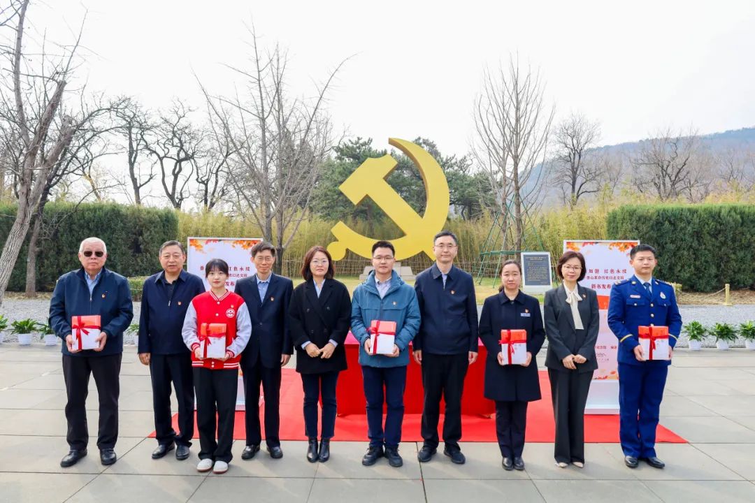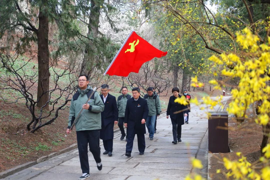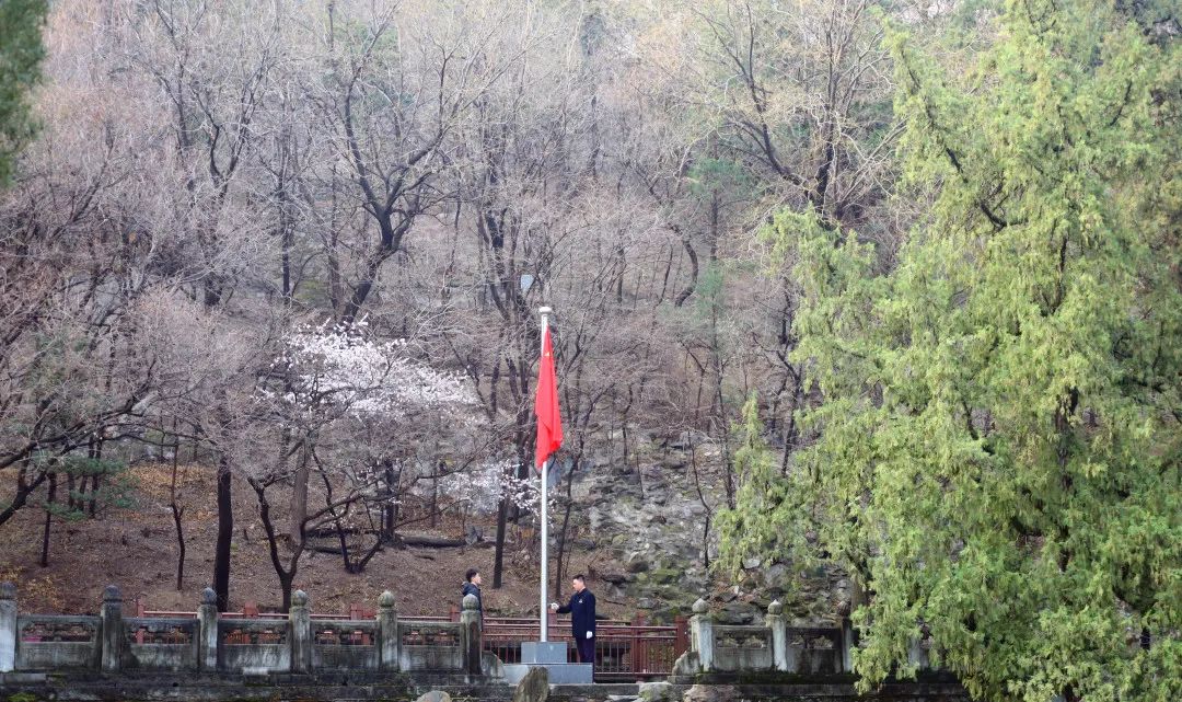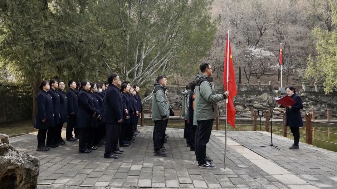 三月的香山春意盎然,来自香山公园、香山革命纪念馆等单位党员干部职工代表齐聚香山公园东门,在鲜红的党旗引领下,向双清别墅行进。