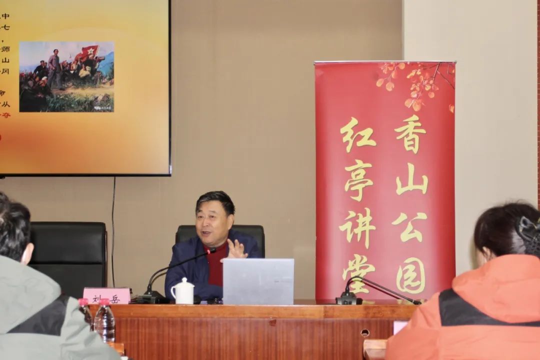今天,2024年度“红亭讲堂”正式启动,再度邀请原中共北京市委党史研究室、北京地方志编纂委员会办公室原副巡视员,北京市中共党史学会常务副会长刘岳为公园党员干部职工、红色文化宣教员以《“进京赶考”到自我革命》为题进行授课,在这个特殊的日子里,带领大家重温1949年中共中央在香山的这段红色历史,学习“进京赶考”的深刻内涵。