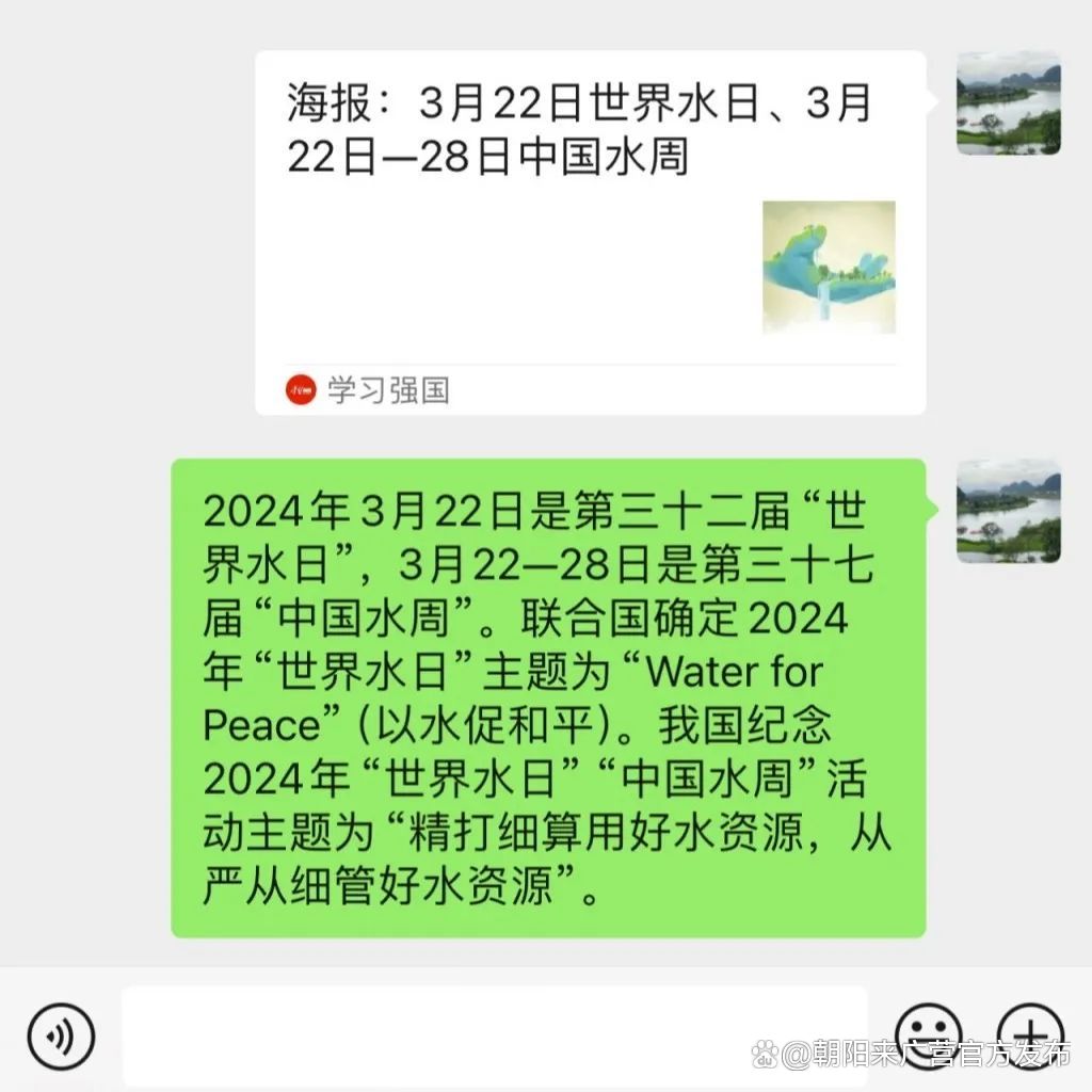 2024年3月22日是第三十二届“世界水日”,3月22日—28日是第三十七届“中国水周”。联合国确定2024年“世界水日”主题为“Water for Peace”(以水促和平)。我国纪念2024年“世界水日”“中国水周”活动主题为“精打细算用好水资源,从严从细管好水资源”。