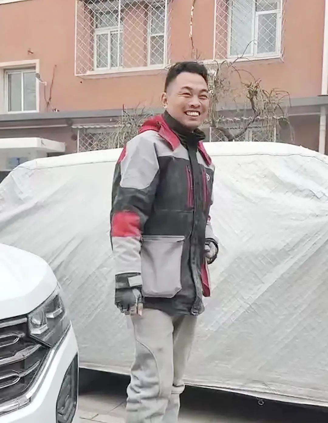 灭火后的陈涛涛满身灭火器干粉。