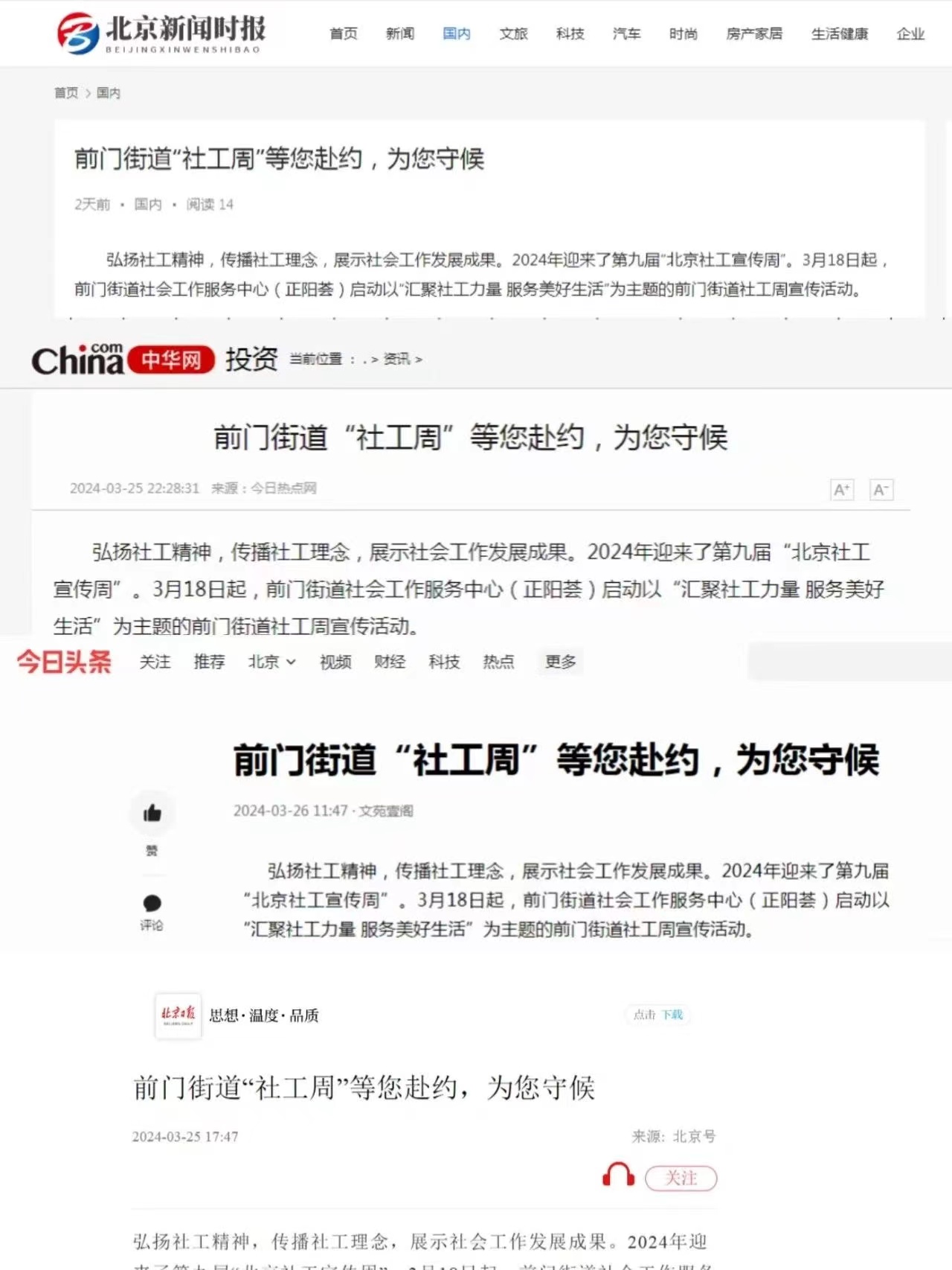 这次宣传周活动得到了北京日报、今日头条、中华网等多家媒体的宣传报道,为了进一步扩大前门街道社会工作宣传范围和效果,我们将采取多种形式对优秀社区社会工作人才开展系列介绍,以此营造人人关心、支持社会工作的良好氛围。