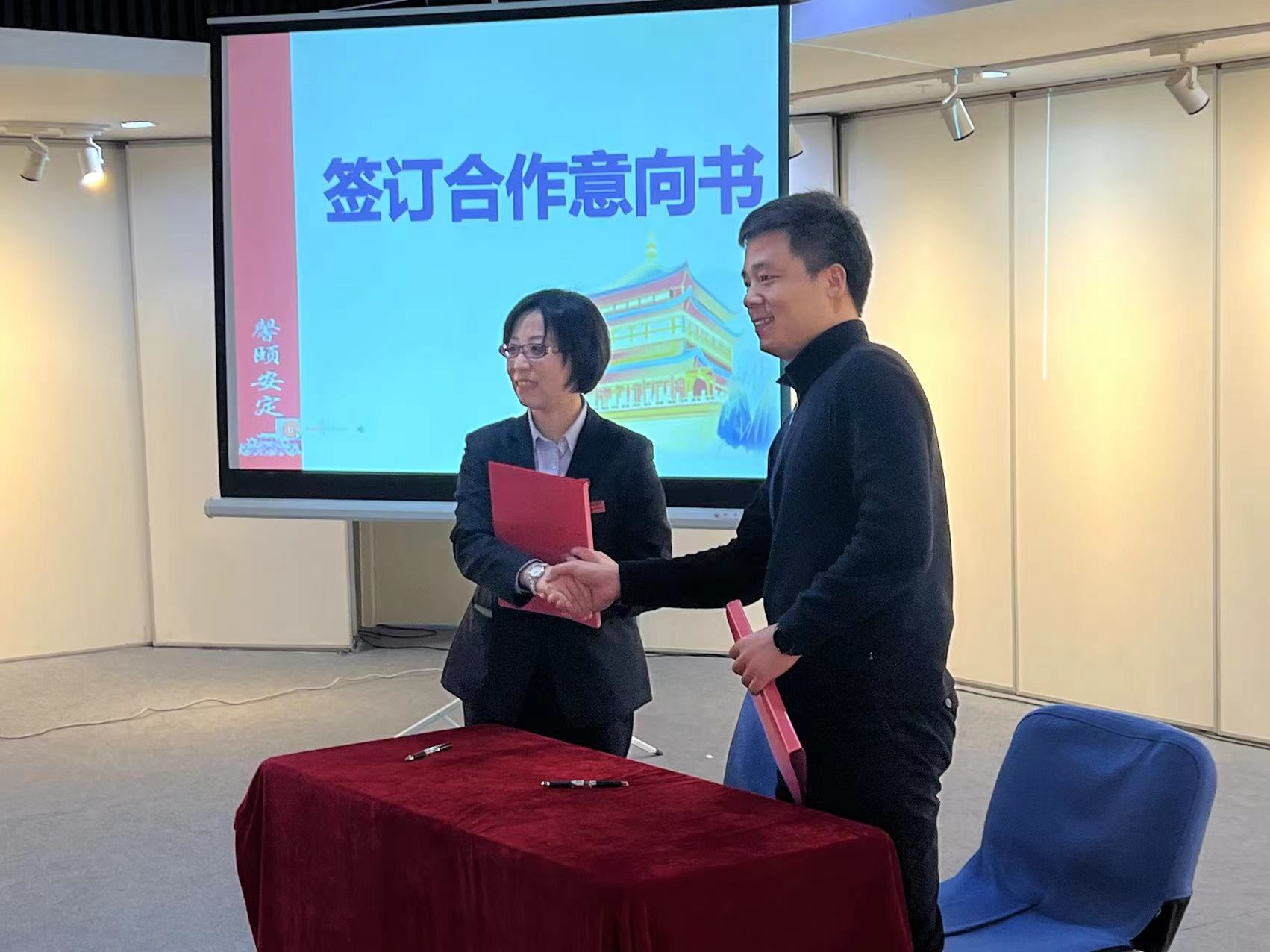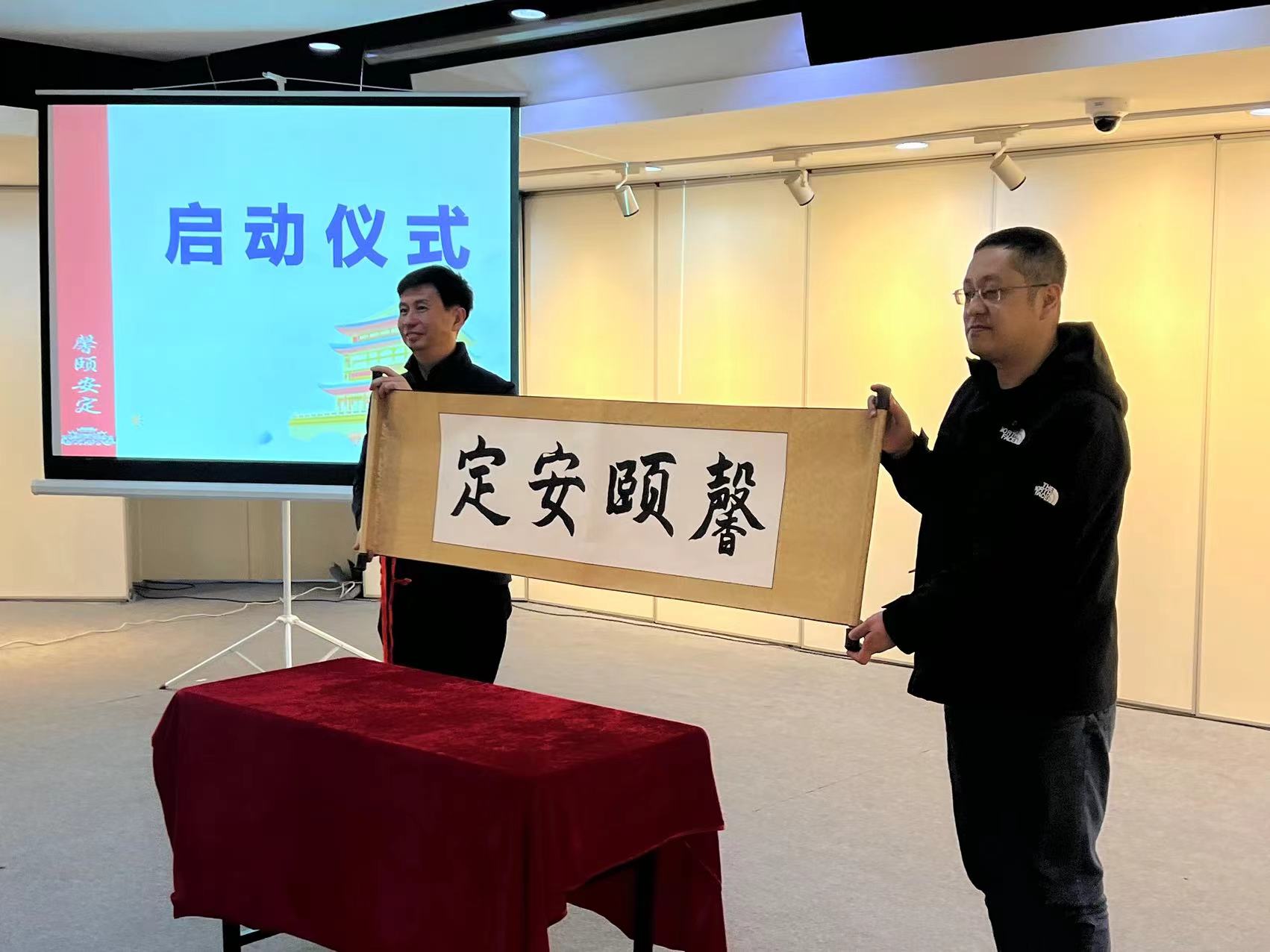 现场,孟宪峰主任与薛峰副主任共同展开“馨颐安定”画轴,便民服务中心副主任谢利利和平安建设办公室副主任魏焕启上台签署合作意向书。