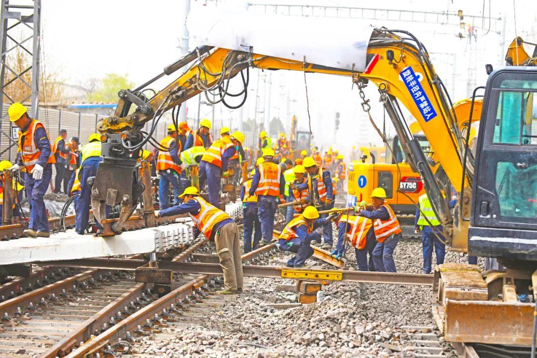 3月28日13时20分,随着天窗命令的下达,辛集站站改施工开始,1100余人涌上线路,现场霎时热闹起来。当天的任务是拆除道岔10组、铺设轨排670米、移动轨排200米、拨接线路670米、小机捣固400米、接触网改造1.32公里、联锁设备改造14处。