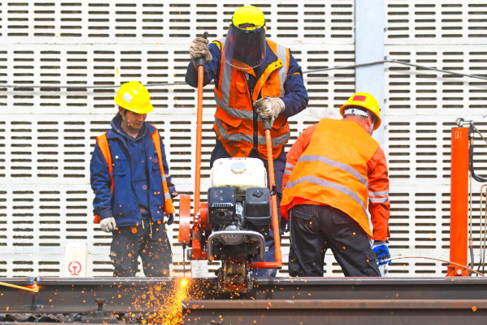 固定好机具,切割钢轨。