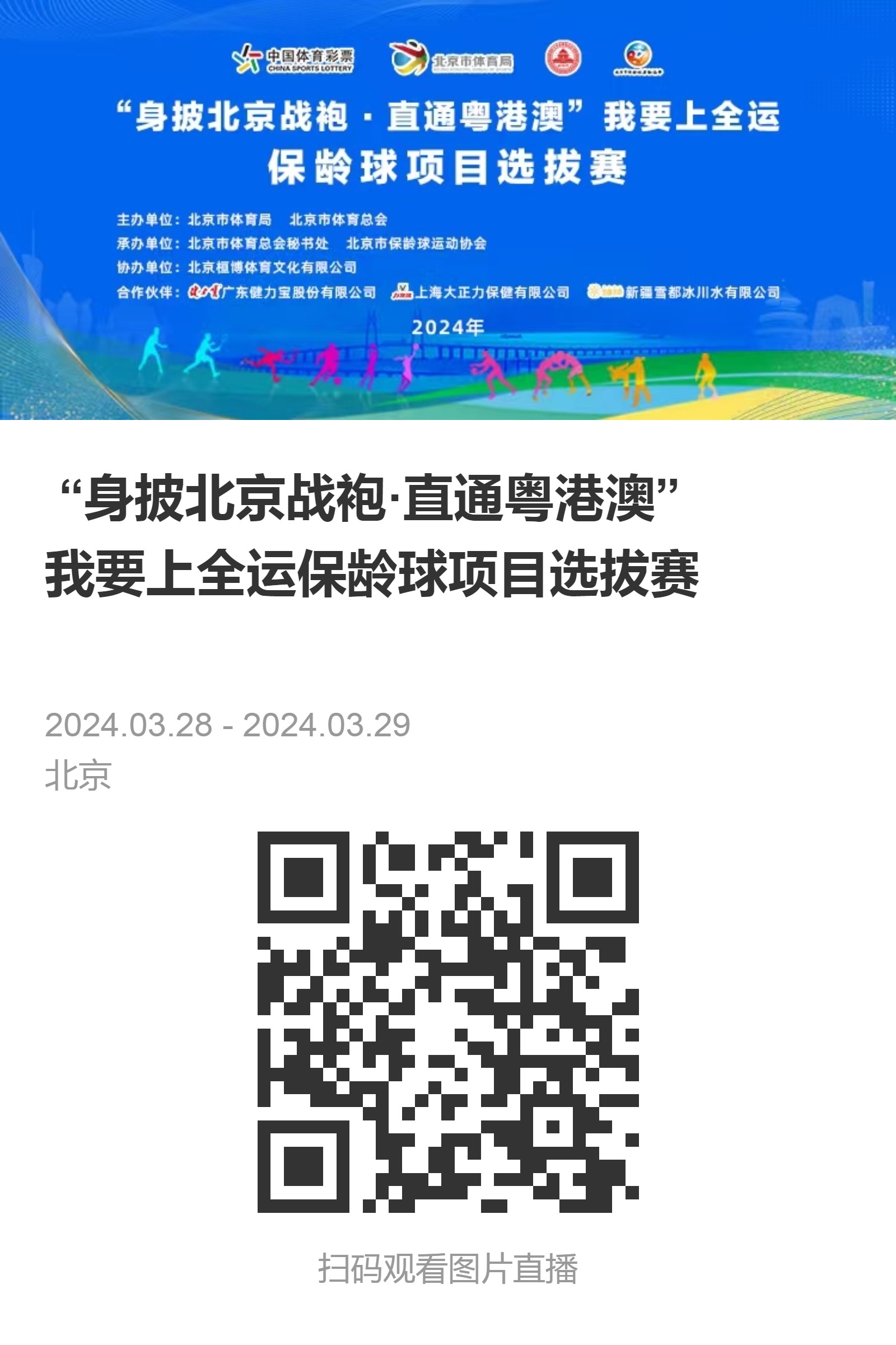 为积极响应全民健身号召,加快推进健康中国和体育强国建设,由北京市体育局、北京市体育总会主办,北京市保龄球协会承办的“身披北京战袍·直通粤港澳-我要上全运”保龄球项目选拔赛于3月28日至29日在北京地坛保龄球馆、北京东环保龄球馆火热举行,共计62名选手报名参与。本次赛事旨在选拔优秀保龄球选手,代表北京市出征即将召开的第十五届全国运动会,进一步推动保龄球运动的普及与发展。