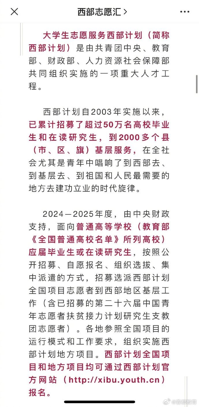 2024年大学生志愿服务西部计划报名通道已于3月31日正式开启。2024年普通高等学校应届毕业生或在读研究生,可通过微信公众号“西部志愿汇”(菜单栏中的“我要报名”)或登录西部计划官网(http://xibu.youth.cn/),在西部计划报名系统中进行注册报名。更多报名信息,戳↓↓查看