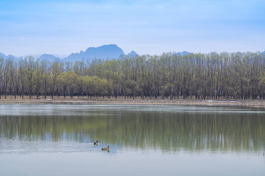 碧绿的湖水倒映着郁郁葱葱的树林,湛蓝的天空与远山连成一片,微风轻拂湖面,泛起阵阵涟漪,宛如一幅自然之美的山水画卷。