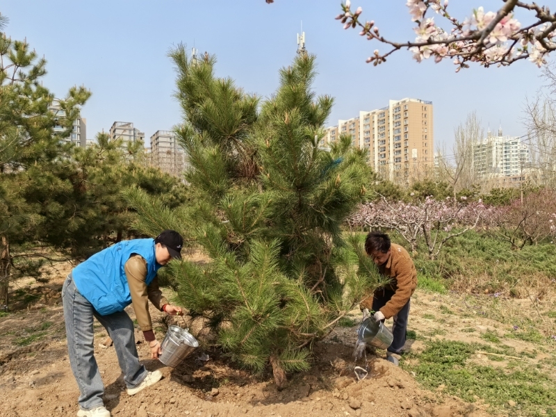 活动现场共50余人,大家热情高涨、干劲十足,四人一组,分工协作,搬运苗木、挥锹铲土、修整围堰、提桶浇水,合力栽下树苗,各个环节衔接有序,分工明确。经过两个小时的辛勤劳动,50余株油松和国槐扎根沃土、迎风挺立,成为春日一道亮丽的风景线,在明媚的春光中展现出盎然的生机与活力。“这次植树活动不仅是一堂生动的劳动课,还激励着我们在今后要养成环保意识,多种一棵树,多增一片绿色,为保护环境贡献我们自己的一份力量。”在场的居民说道。植树活动结束后,青塔街道还为参加活动的居民、志愿者发放了森林防火宣传折页,清明节即将到来,以此为契机,营造森林防火的浓厚氛围。