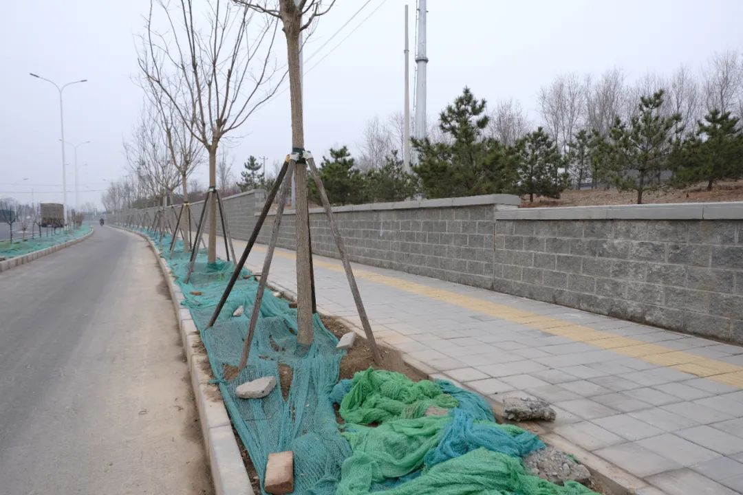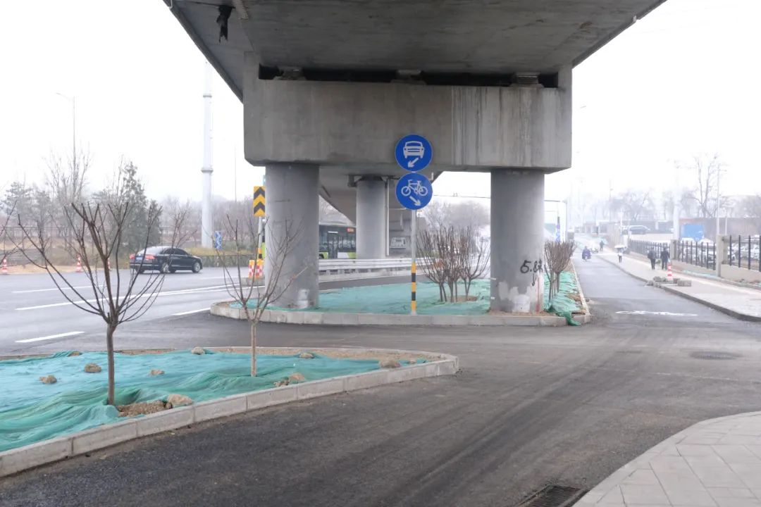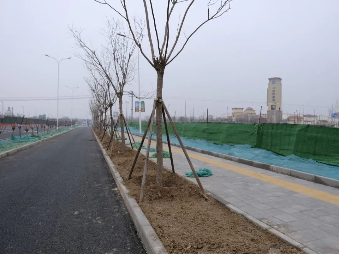 道路改扩建后,路面平坦宽阔,车辆通行顺畅。路旁的绿化带用绿布苫盖,并栽种了新的树苗。人行步道铺设了新的地砖,更显整齐。