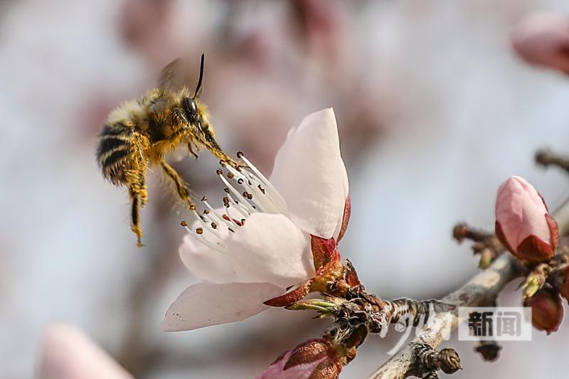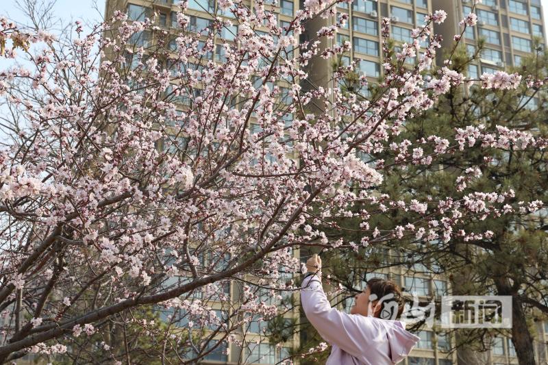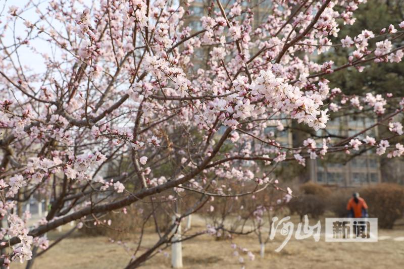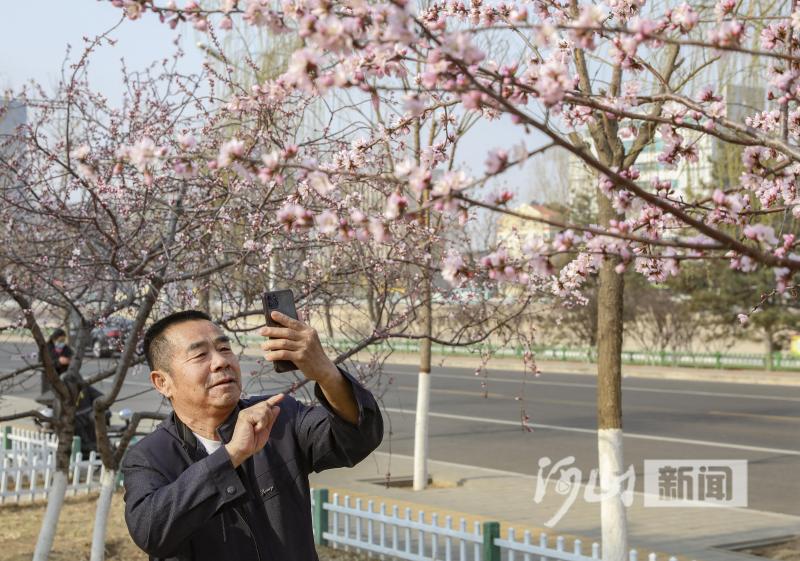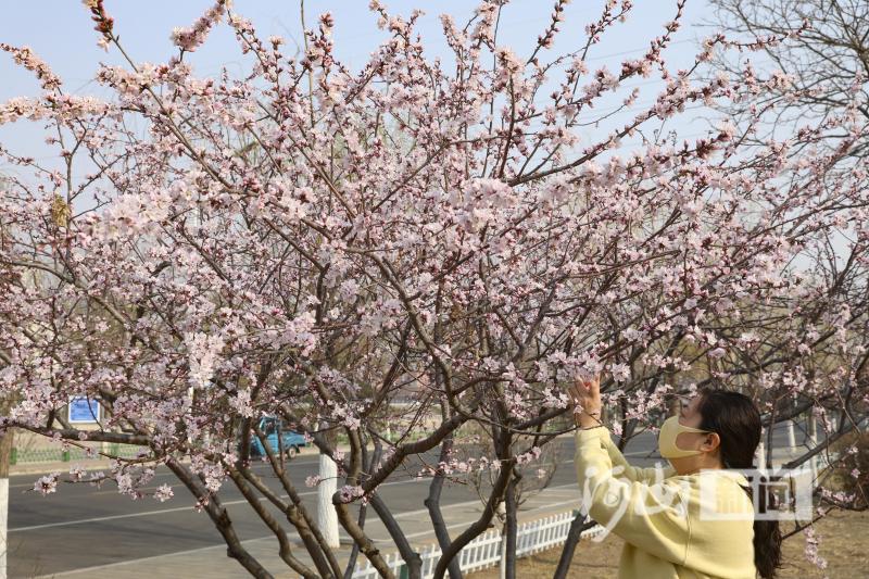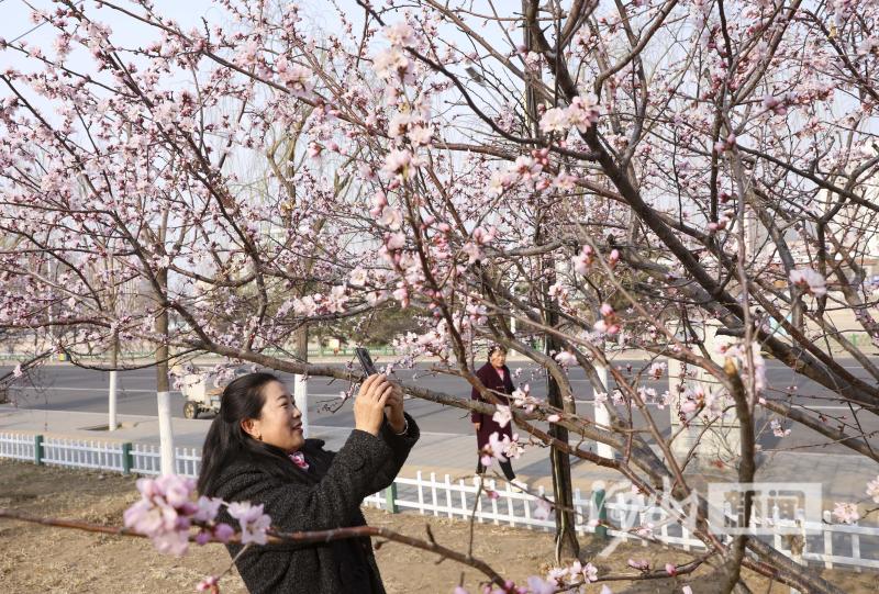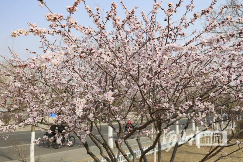 4月1日,张家口市区滨河南路清水河畔游园内的山桃花竞相绽放、争奇斗艳,吸引市民纷纷驻足观赏。