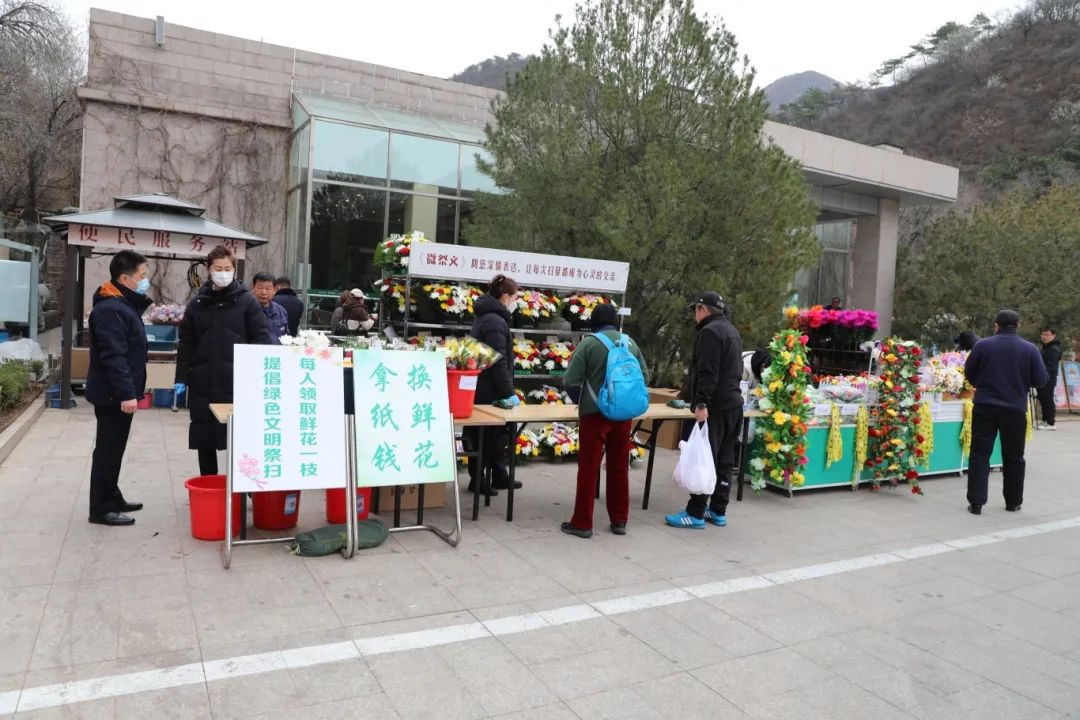 在八达岭人民公墓,一进入园区就能看到醒目的便民服务亭,接待岗前工作人员正在免费向祭扫市民发放鲜菊花,同时,提供小推车、轮椅、祈福卡及擦碑工具等多项便民惠民服务措施。接待岗旁数十个关于文明祭扫宣传及惠民殡葬政策宣传的展示牌更是吸引了祭扫市民纷纷驻足观看。园区右侧,急救、消防、交通、应急等单位人员车辆全体待命,全方位做好祭扫期间人员交通、应急等多方面安全保障。