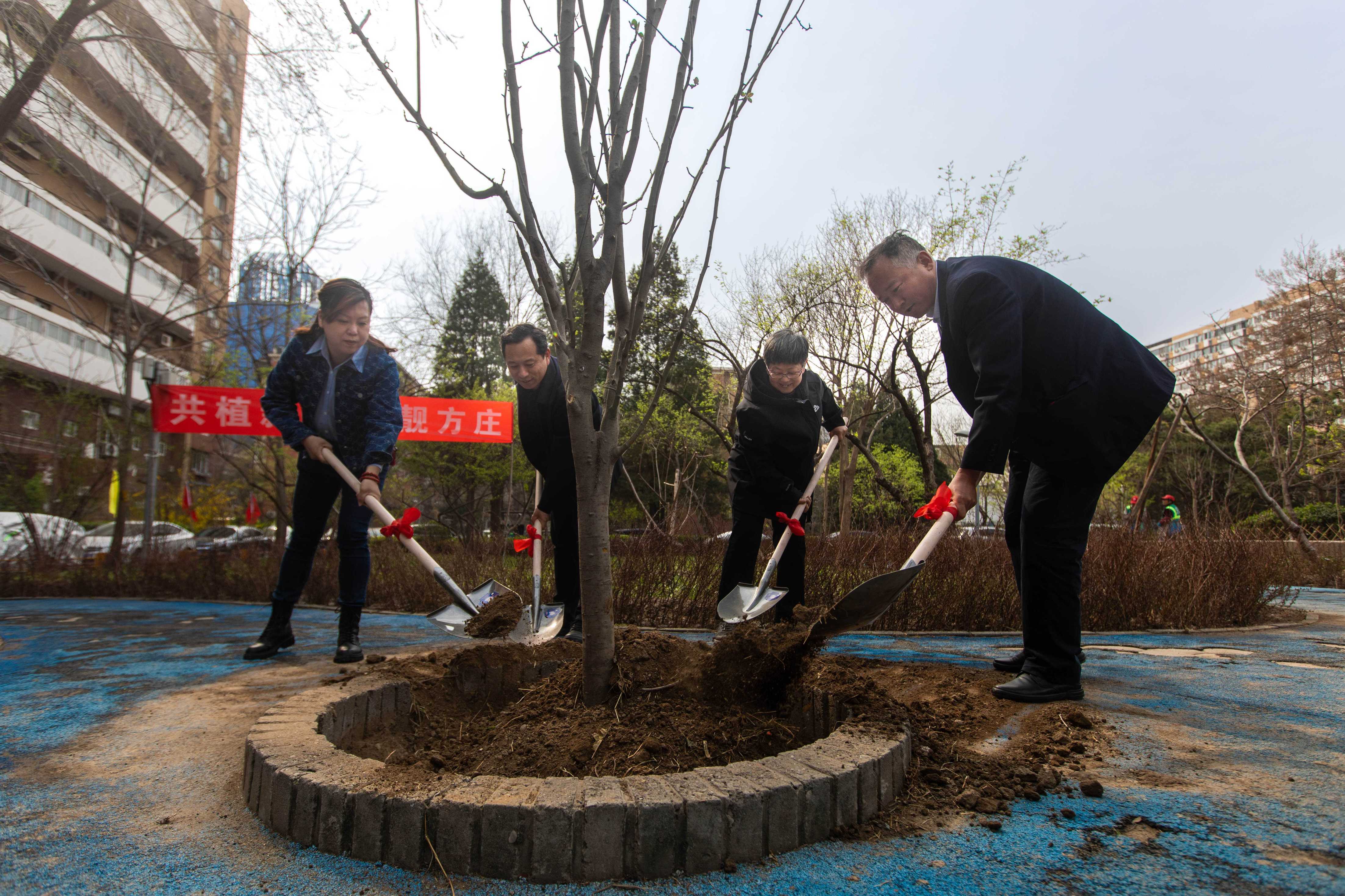记者走进芳星园三区,小区中心花园正在进行一场植树活动。在“共植新绿 扮靓方庄”的横幅下,方庄街道党政主要领导、物业首开城运集团天岳恒公司工作人员及其他相关领导正齐心协力地挥锹铲土,将一株株西府海棠树苗移植在土坑中。青葱挺拔的西府海棠在春泥中扎根,在春风中生长,为方庄街道的绿化提升工作又增添了新的勃勃生机。