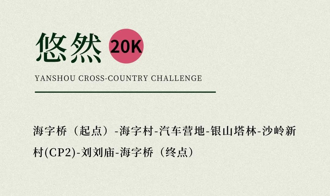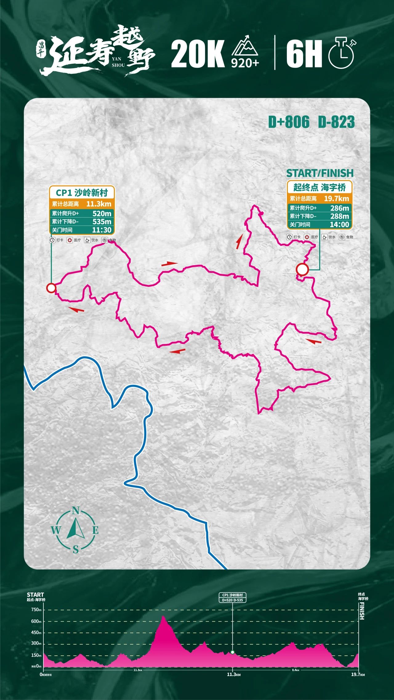 20公里为环形闭合路线,起终点均位于海字桥,实际距离19.7公里,累计爬升806米,累计下降823米,赛道最高海拔688米,最低海拔298米。关门时间6小时。