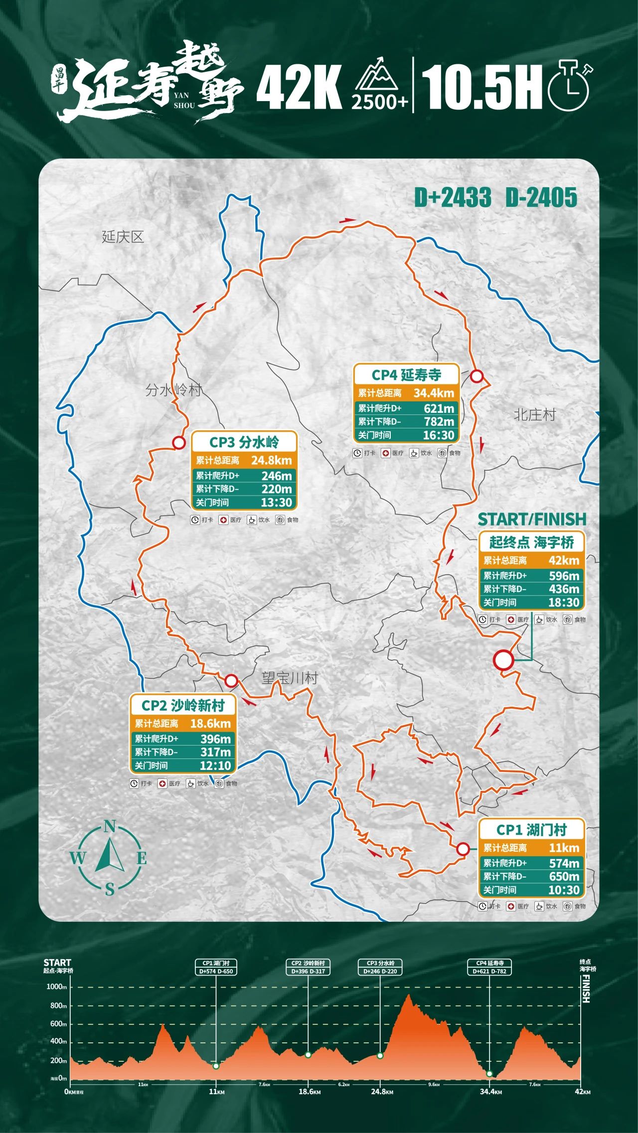 42公里为环形闭合路线,起终点均位于海字桥,实际距离42.2公里,累计爬升2418米,累计下降2430米,赛道最高海拔946米,最低海拔217米。关门时间10.5小时。
