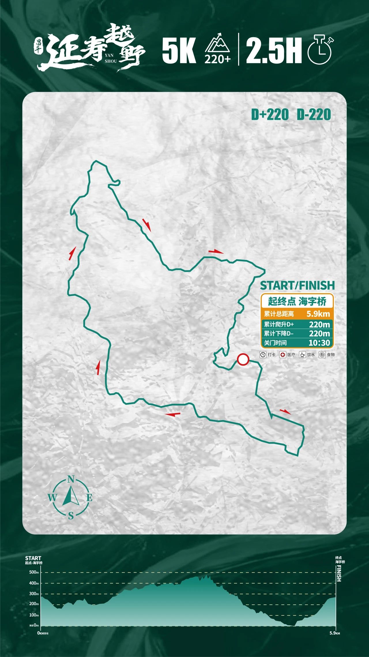 5公里为环形闭合路线,起终点均位于海字桥,实际距离5.9公里,累计爬升220米,累计下降220米,赛道最高海拔492米,最低海拔298米。关门时间2.5小时。