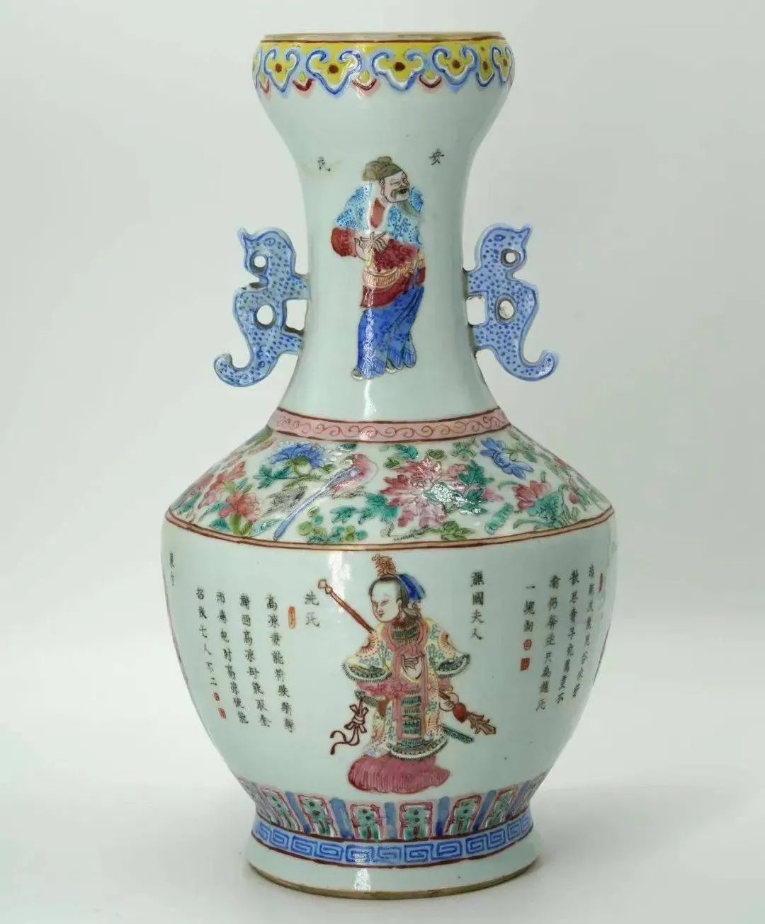 ▲清道光年间的粉彩无双谱人物(谯国夫人)诗文双螭耳蒜头瓶(图片来源:高州市博物馆微信公众号)