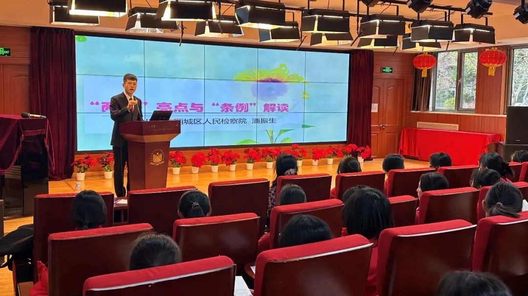 随后,潘振生以“两法”亮点与“条例”解读为主题,为同学们讲授法治课。