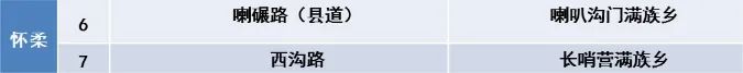 分别为:西甘路(怀柔镇)、兴水路(渤海镇)、西沟路(长哨营满族乡)、吉寺路(九渡河镇)和前青路(琉璃庙镇),喇碾路(喇叭沟门满族乡)。