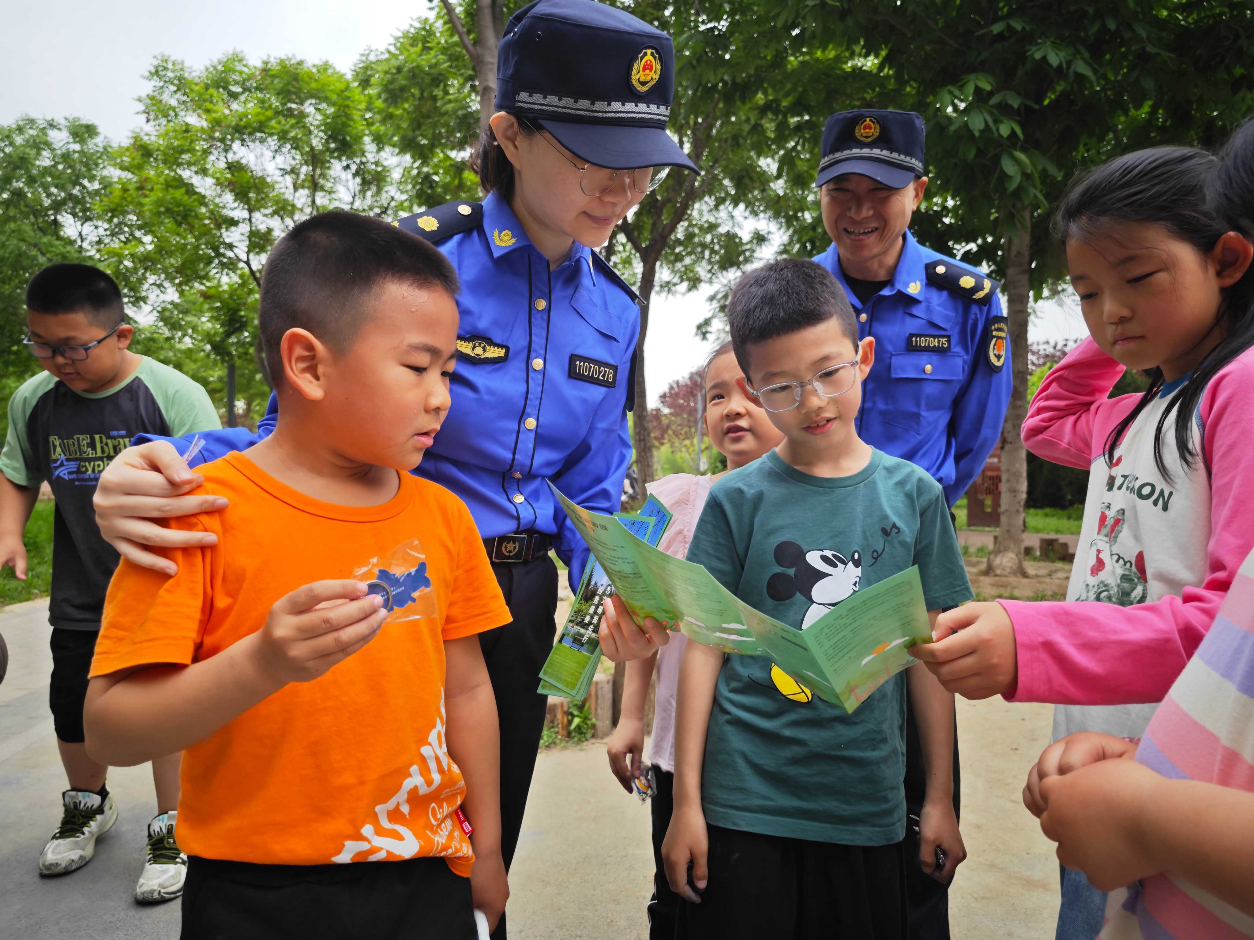 “小朋友们,枝条脆弱,小草正在悄悄长大,郁金香正在努力开放,大家一定要做好护花使者,好好保护它们哦。”“好!”碰到来游园的小朋友们时,执法队员用热情亲切的讲解为他们上了一节生动有趣的文明教育课,稚嫩清脆的童音也引导着过往游客一起加入到了文明游园宣传的队伍里。