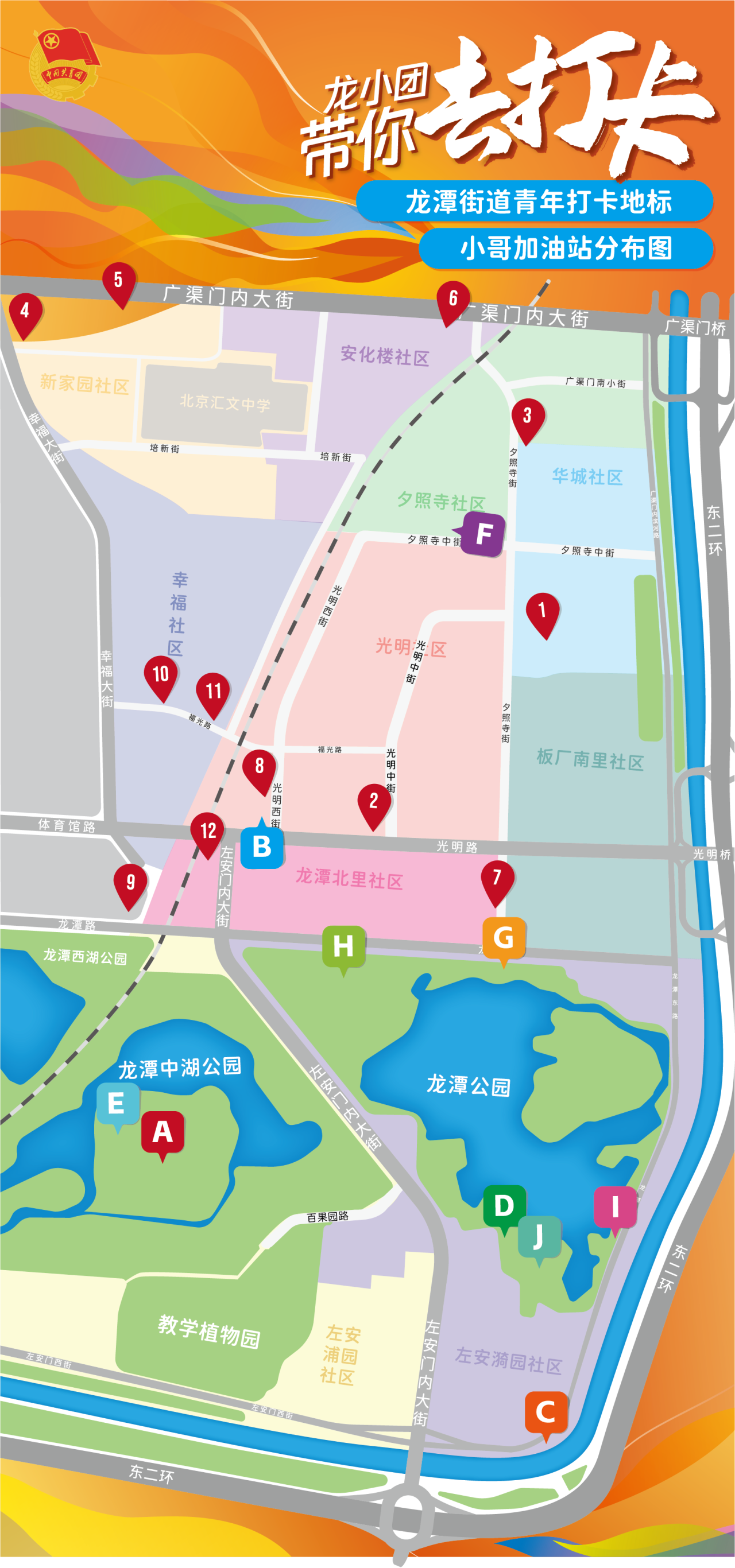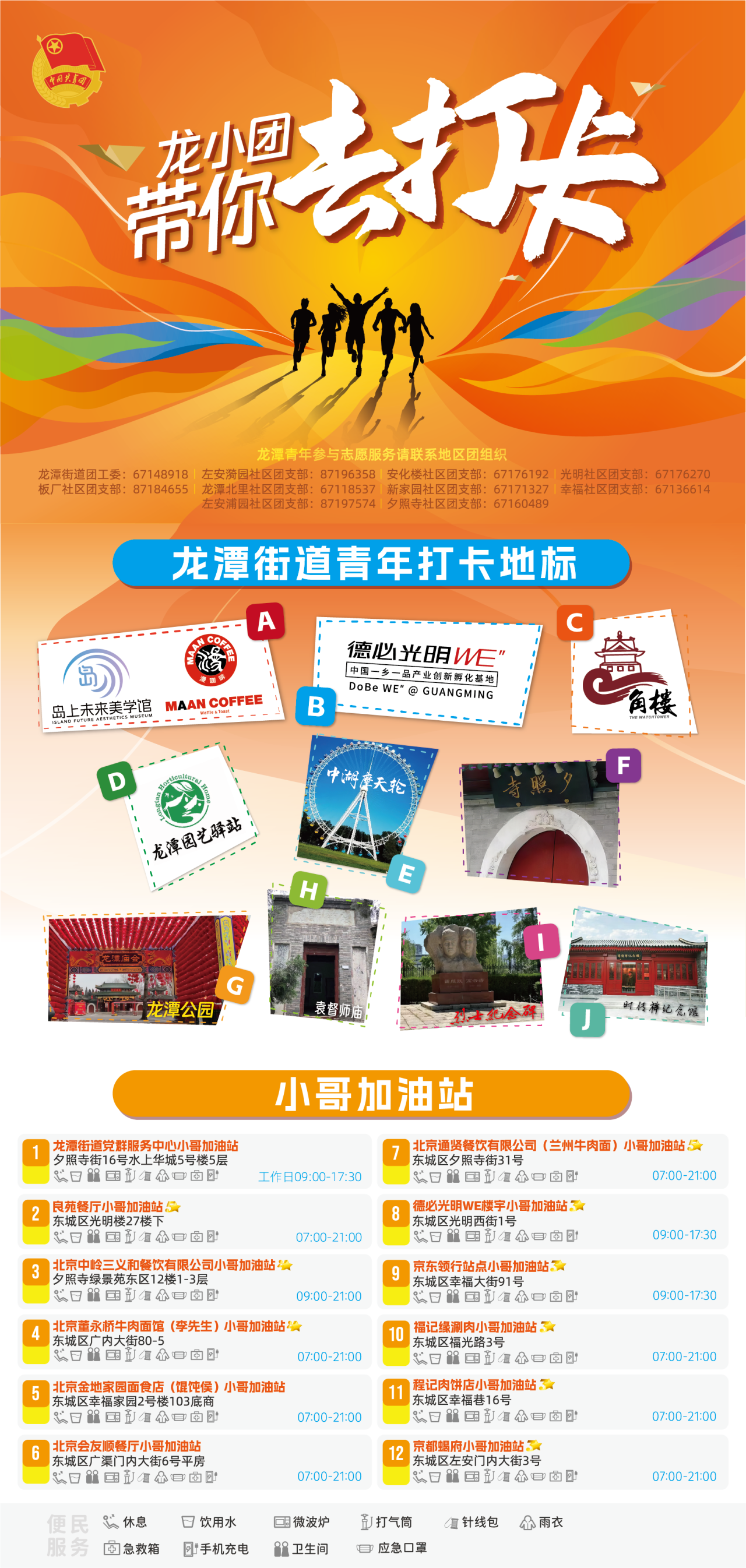 街道团工委在地区12个临街餐厅成立“小哥加油站”,为快递小哥等两新群体提供打折餐食、纳凉饮水等服务。同时绘制了辖区打卡地图,让地区青年走进龙潭地标和网红打卡地,感受美丽、宜居的龙潭。