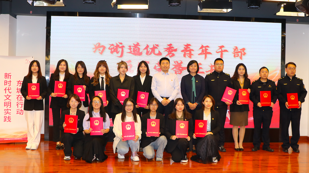 街道工委书记冯业水,工委副书记、办事处主任张莉莉为街道2023年度考核中获得奖励的青年干部颁发证书