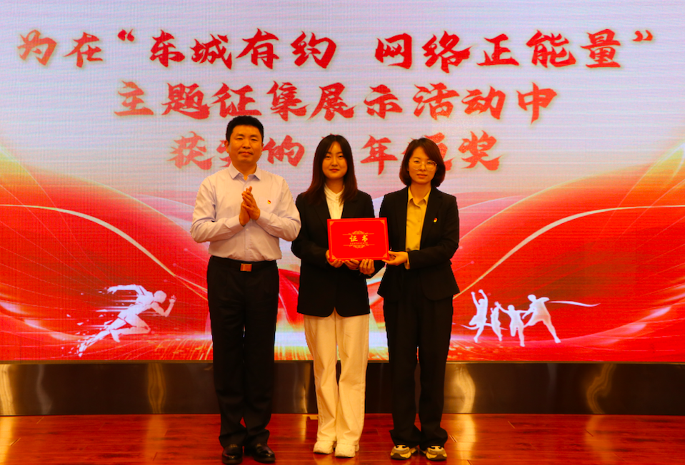 街道工委书记冯业水为在“东城有约 网络正能量”主题征集展示活动中获奖的青年干部陶静、江媛媛颁奖