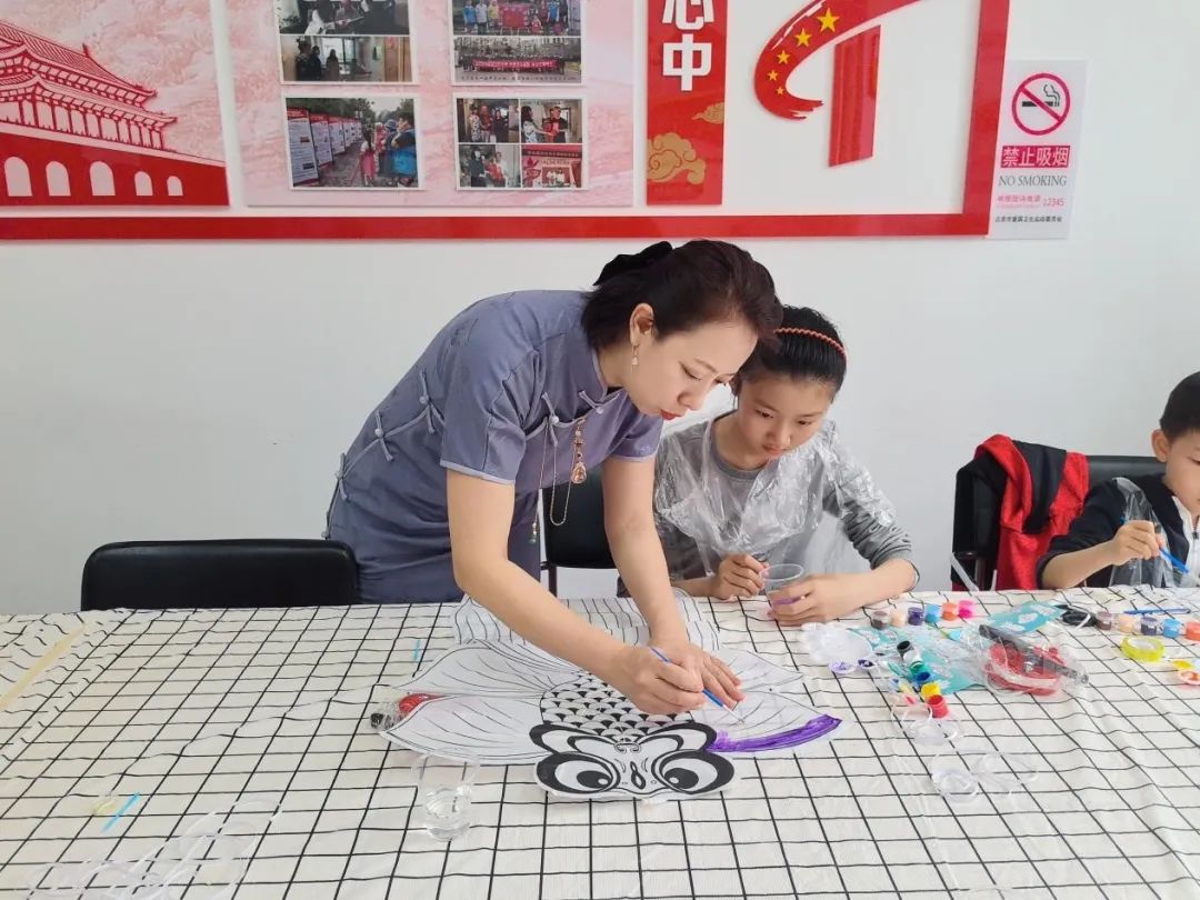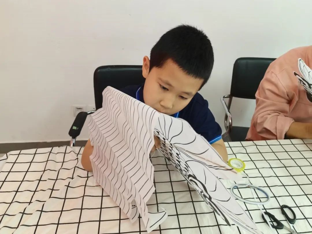 活动中,老师介绍风筝的起源与发展:“风筝最早出现在春秋战国时期用于军事用途......传统的风筝技艺包括扎、糊、绘、放,本节课咱们主要学习扎、绘风筝。”