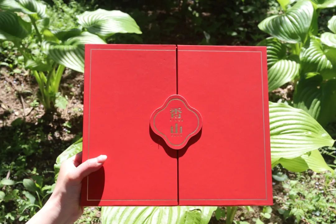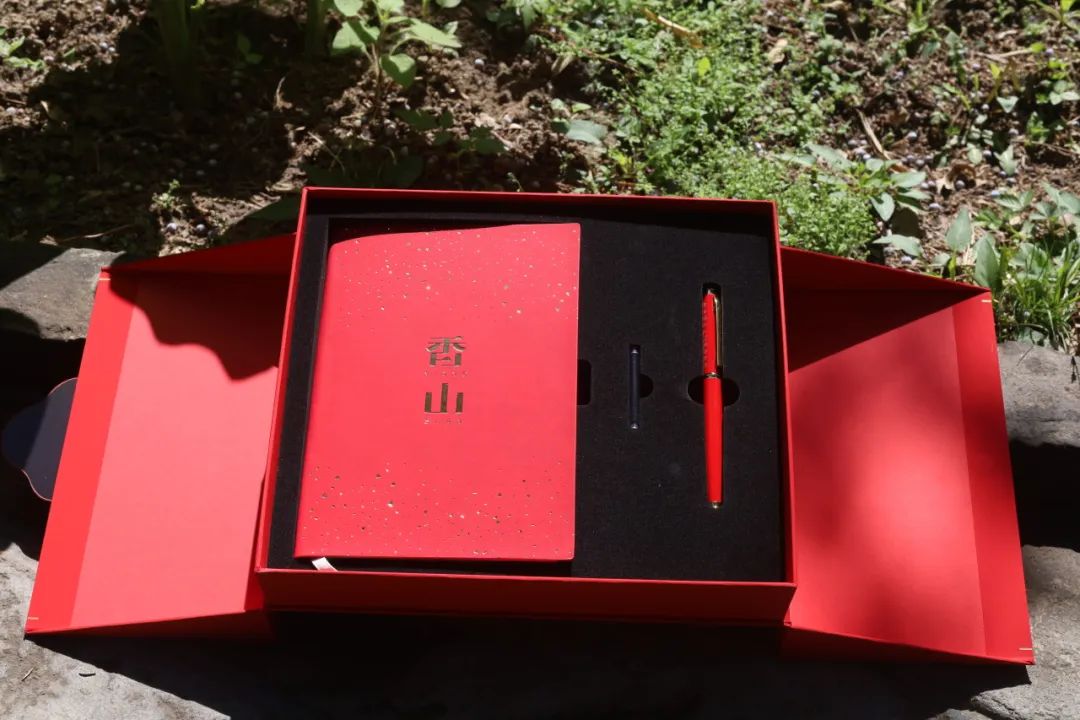红色笔记本套装,写有“香山”二字的红色笔记本,简约大气,搭配金色钢笔,设计精美,寓意深远。