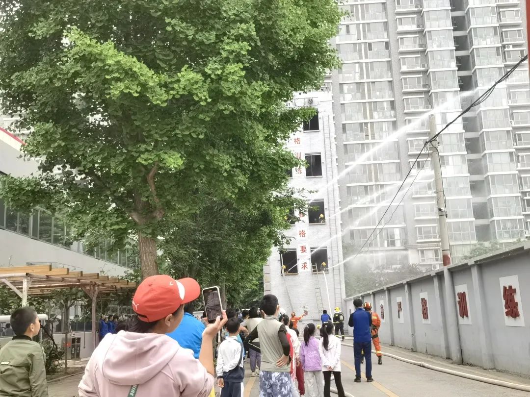 在火灾场景模拟现场,消防员们向孩子们展示如何正确使用灭火器材进行灭火。