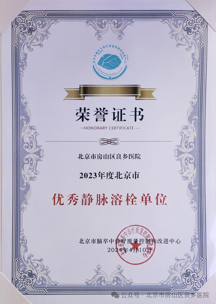 近日,在北京市脑卒中诊疗质量控制和改进中心举办的年度工作会议暨北京市百万减残工程推进会上,房山区第一医院、良乡医院再次入围2024年新版北京市脑卒中急救地图,并获得北京市“优秀静脉溶栓单位”荣誉称号。