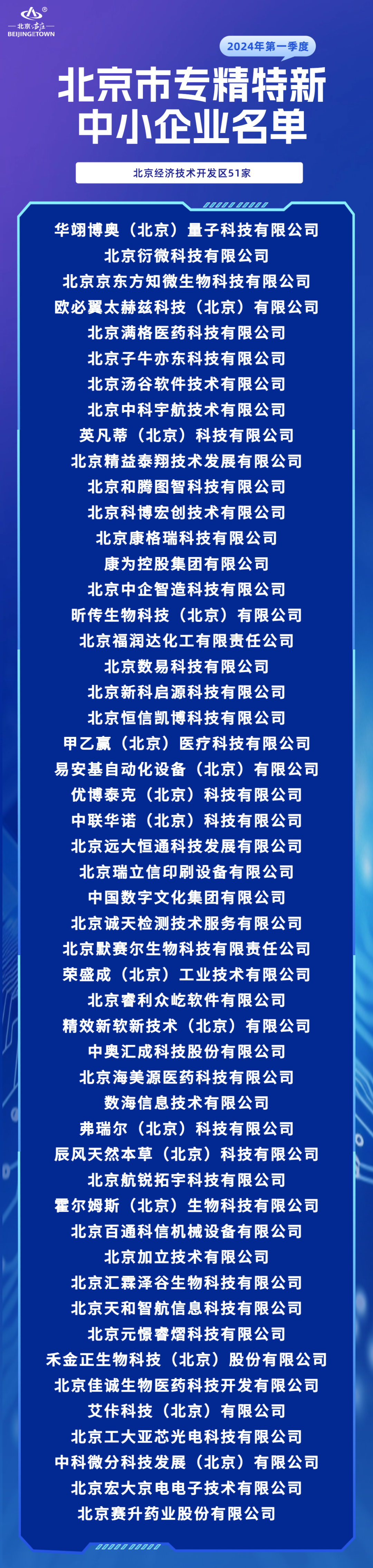 据北京市经济和信息化局公告的2024年第一季度北京市专精特新中小企业名单,华翊博奥(北京)量子科技有限公司、北京和腾图智科技有限公司、欧必翼太赫兹科技(北京)有限公司、北京汤谷软件技术有限公司、北京中科宇航技术有限公司等51家北京亦庄企业上榜。