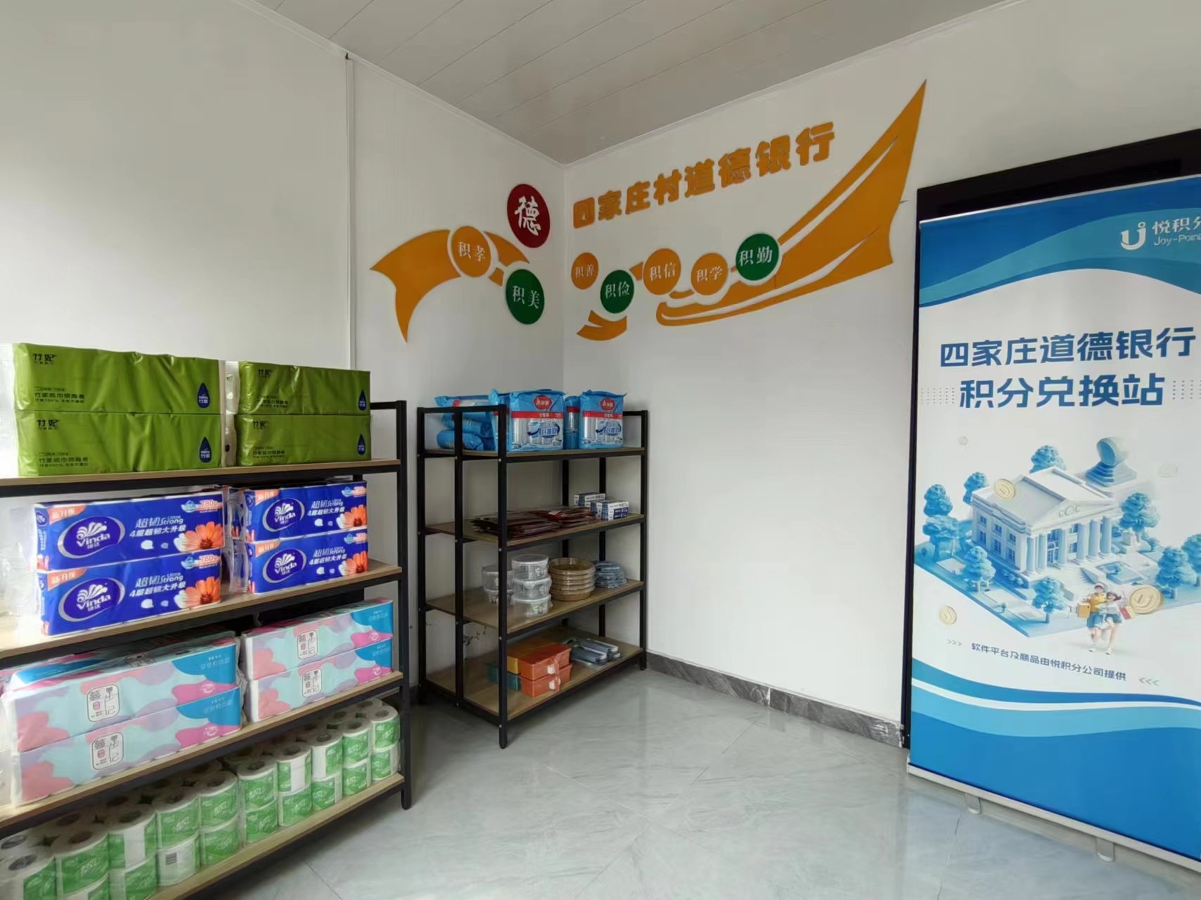 在“道德银行”积分兑换站里,琳琅满目的生活用品整齐地摆放着,从抽纸、肥皂到烧水壶、食用油等,都贴有根据商品价格制定的“积分”标签,明码标“价”。村民们可以根据自己的道德信用积分选择心仪的物品。