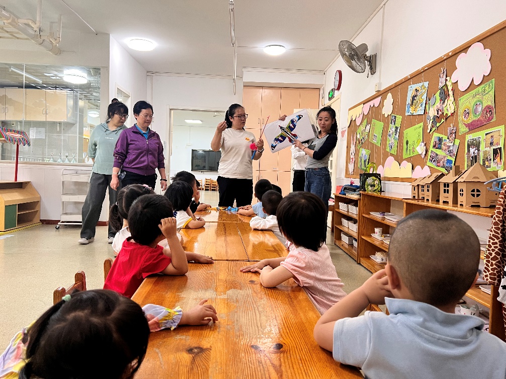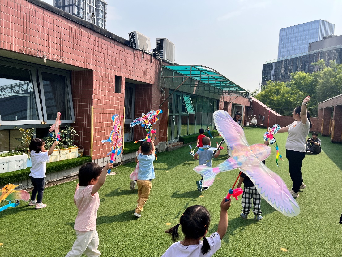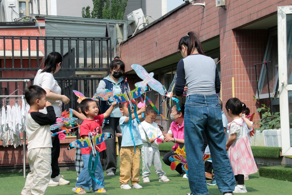 随后,小朋友们开始精心为妈妈准备“礼物”,从搭建风筝的“筋骨”,到相连头身、翅膀,很快小小的风筝就制作完成。惠风和畅,春意盎然,正是风筝放飞的好时节。在老师和社区志愿者的带领下,小朋友们来到草坪上,把对母亲浓浓的爱意放飞。“你们看,我的风筝飞上天啦!”“我做的风筝飞得更高,哇,太厉害了!”风筝在空中飘动,小朋友们个个仰头观望,欢乐的笑声在天空中回荡。